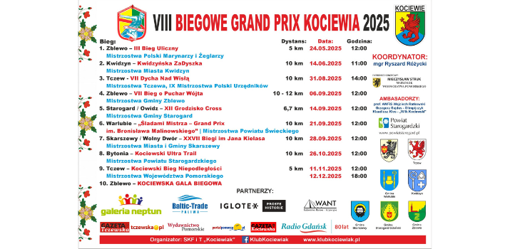 W tym roku VIII Biegowe Grand Prix Kociewia zaczyna się 24 maja w Zblewie – III Bieg Uliczny – III Mistrzostwa Polski Marynarzy i Żeglarzy. Jest to najstarszy cykl biegowy na Kociewiu i marka biegów rozpoznawalna na całym Pomorzu od Koszalina po Olsztyn, Bydgoszcz i Toruń.