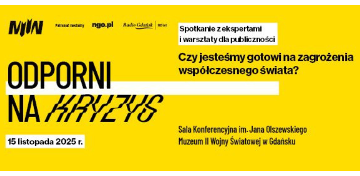 Czy jesteśmy gotowi na zagrożenia współczesnego świata? Wojna, dezinformacja, blackouty, katastrofy – to realne wyzwania XXI wieku. Dowiedz się, jak reagować i budować lokalną odporność! Zapraszamy 15 listopada w godz. 11:00 – 16:15 do MIIWŚ na spotkania z ekspertami i warsztaty dla publiczności „ODPORNI NA KRYZYS”.