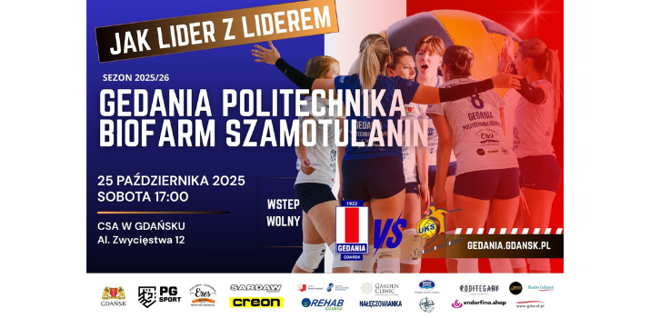 Zapraszamy na kolejny mecz rundy zasadniczej sezonu 2025/2026 w 2. Lidze Siatkówki Kobiet. Gedania Politechnika Gdańsk będzie gościć BIOFARM Szamotulanin Szamotuły. Spotkanie odbędzie się w najbliższą sobotę, 25 października, o godzinie 17:00 w Centrum Sportu Akademickiego Politechniki Gdańskiej przy Al. Zwycięstwa 12.