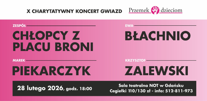 Fundacja Przemek Dzieciom zaprasza na „X Charytatywny Koncert Gwiazd Przemek Dzieciom”!, Scena Teatralna NOT w Gdańsku, 28 lutego 2026r., godz. 18:00. Wystąpią: Chłopcy z Placu Broni, Ewa Błachnio, Marek Piekarczyk, Krzysztof Zalewski, Roman Czejarek.