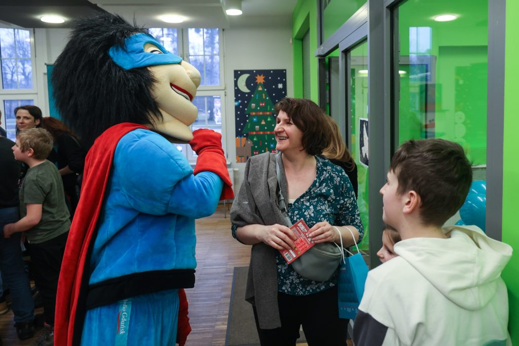 Na gości przed salą czekała nasza radiowa maskotka przedstawiająca superbohatera.