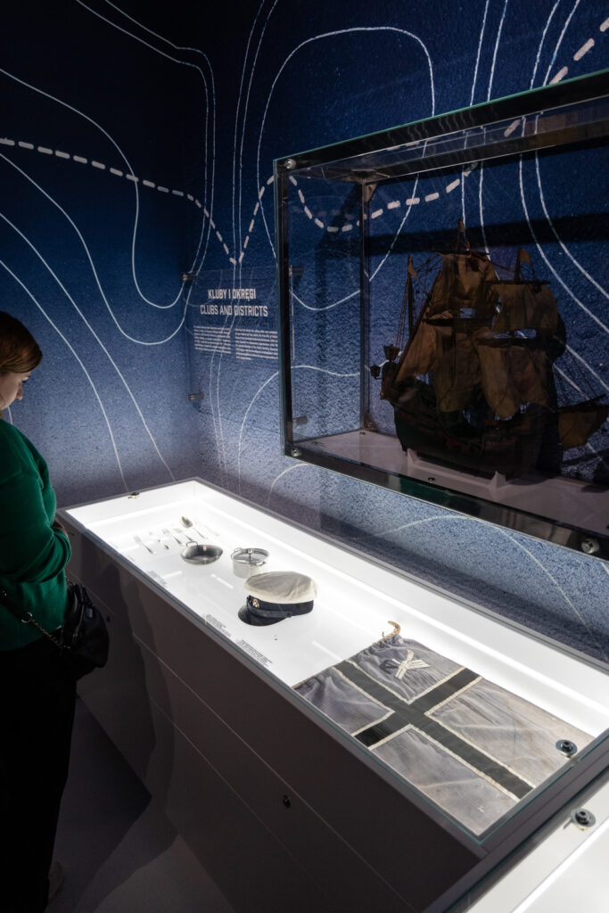 Z kolei w sekcji „Wychowanie morskie” goście zobaczą między innymi strój żeglarski z dwudziestolecia międzywojennego, przedwojenną księgę rozkazów z „Zawiszy Czarnego” i przedmioty należące do generała Mariusza Zaruskiego. Obok nich znajdą się: rękawica bosmańska, młotek z położenia stępki pod „Pogorię” i nieodzowne dla żeglarstwa dziedzictwo muzyczne – szanty i instrumenty, na których grywali Marek Szurawski i Jerzy Porębski. Na wystawie znalazła się też oryginalna czapka Yacht Klubu Polski, należąca niegdyś do Ludwika Szwykowskiego, prezesa Polskiego Związku Żeglarskiego w latach 1926-1929 i autora pierwszego polskiego podręcznika żeglarskiego. Pokazana zostanie również bandera Akademickiego Związku Morskiego z 1934 roku, a także elementy metalowej zastawy z Polskiego Klubu Morskiego, które przetrwały II wojnę światową ukryte w… kurniku.