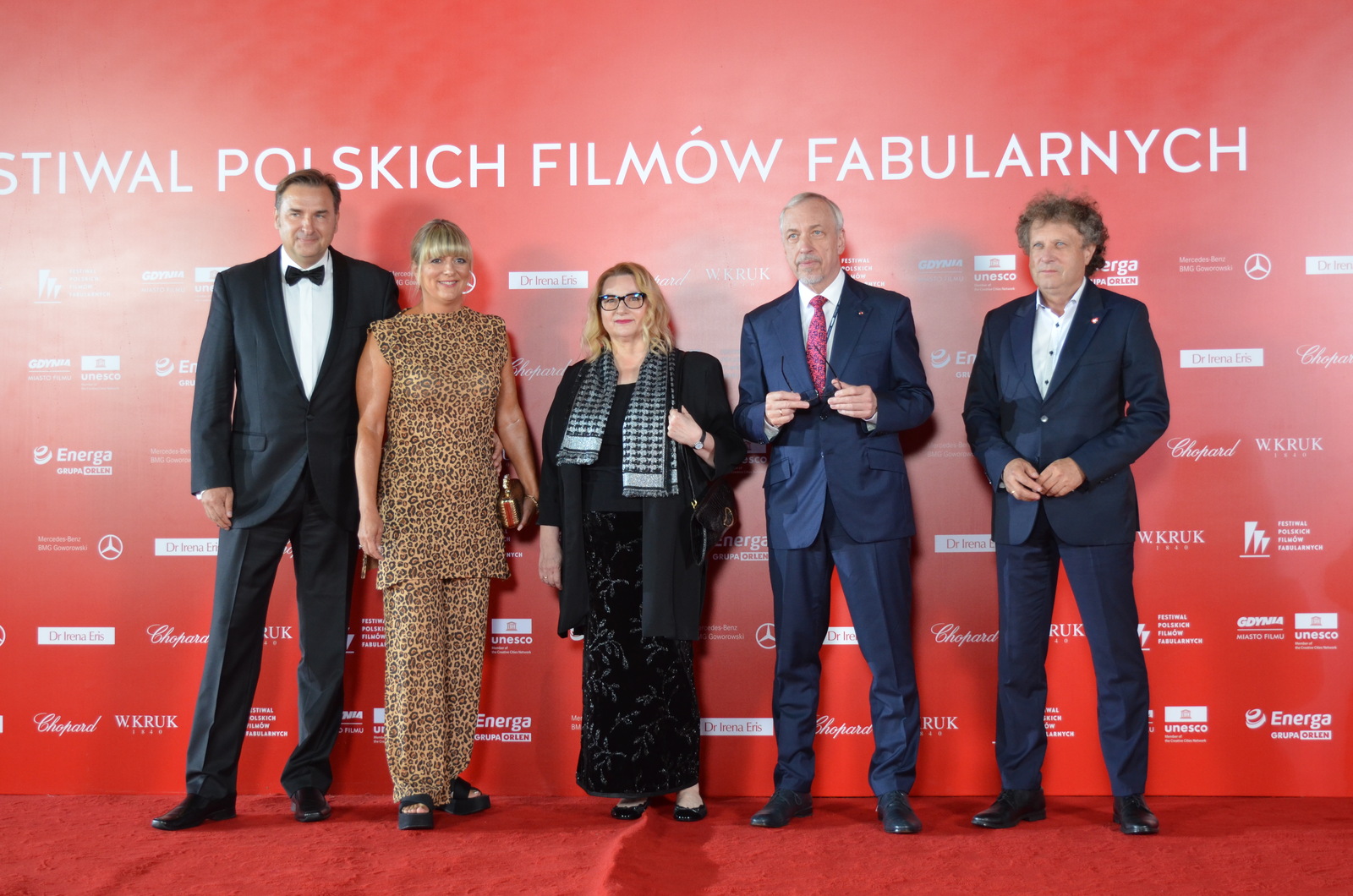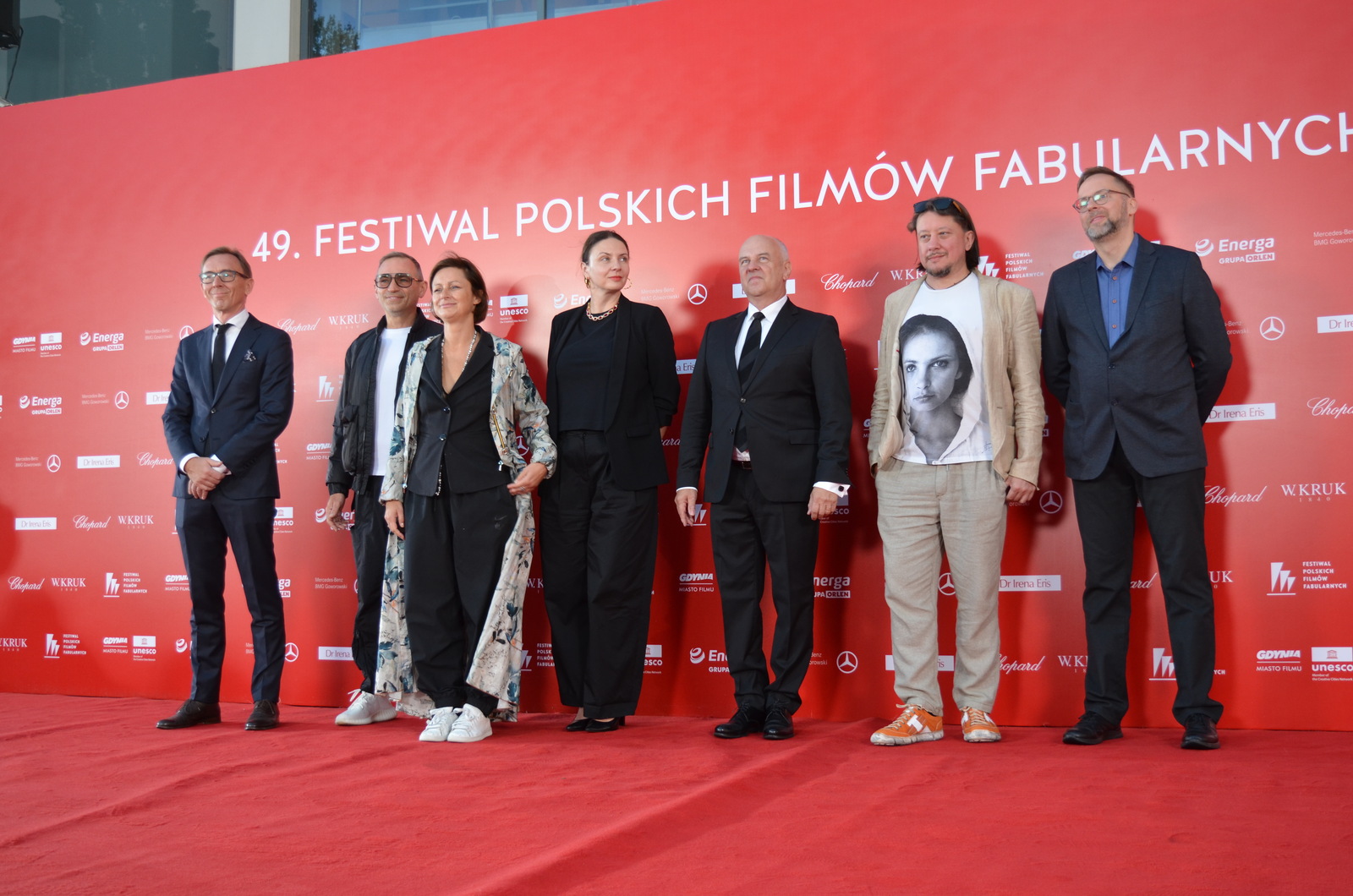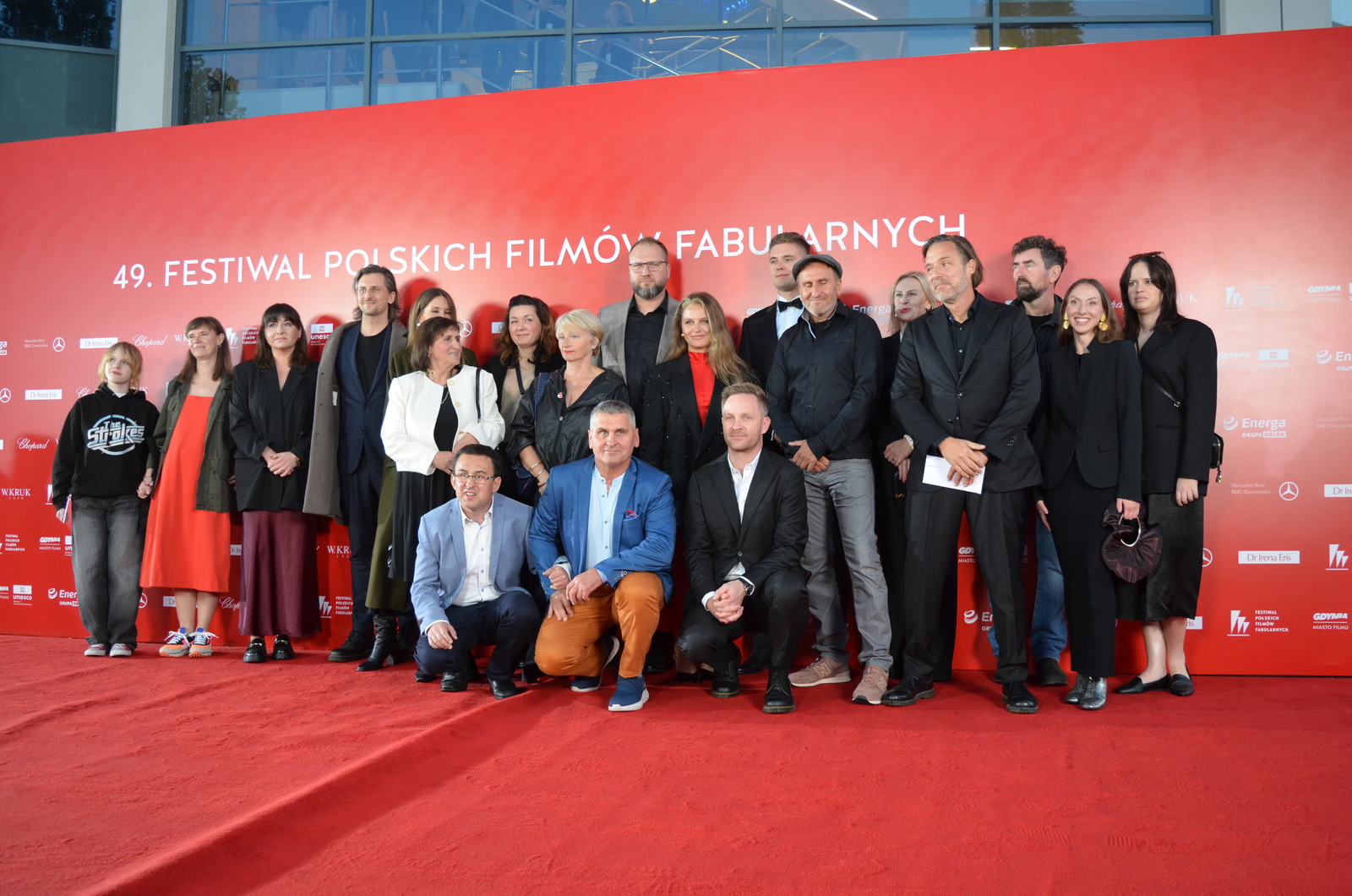 Reżyser Xawery Żuławski z ekipą tworzącą film „Kulej. Dwie strony medalu” oraz członkami rodziny Jerzego Kuleja na czerwonym dywanie 49. FPFF. Film był drugim z najdłużej oklaskiwanych na festiwalu (fot. Radio Gdańsk/Piotr Puchalski)