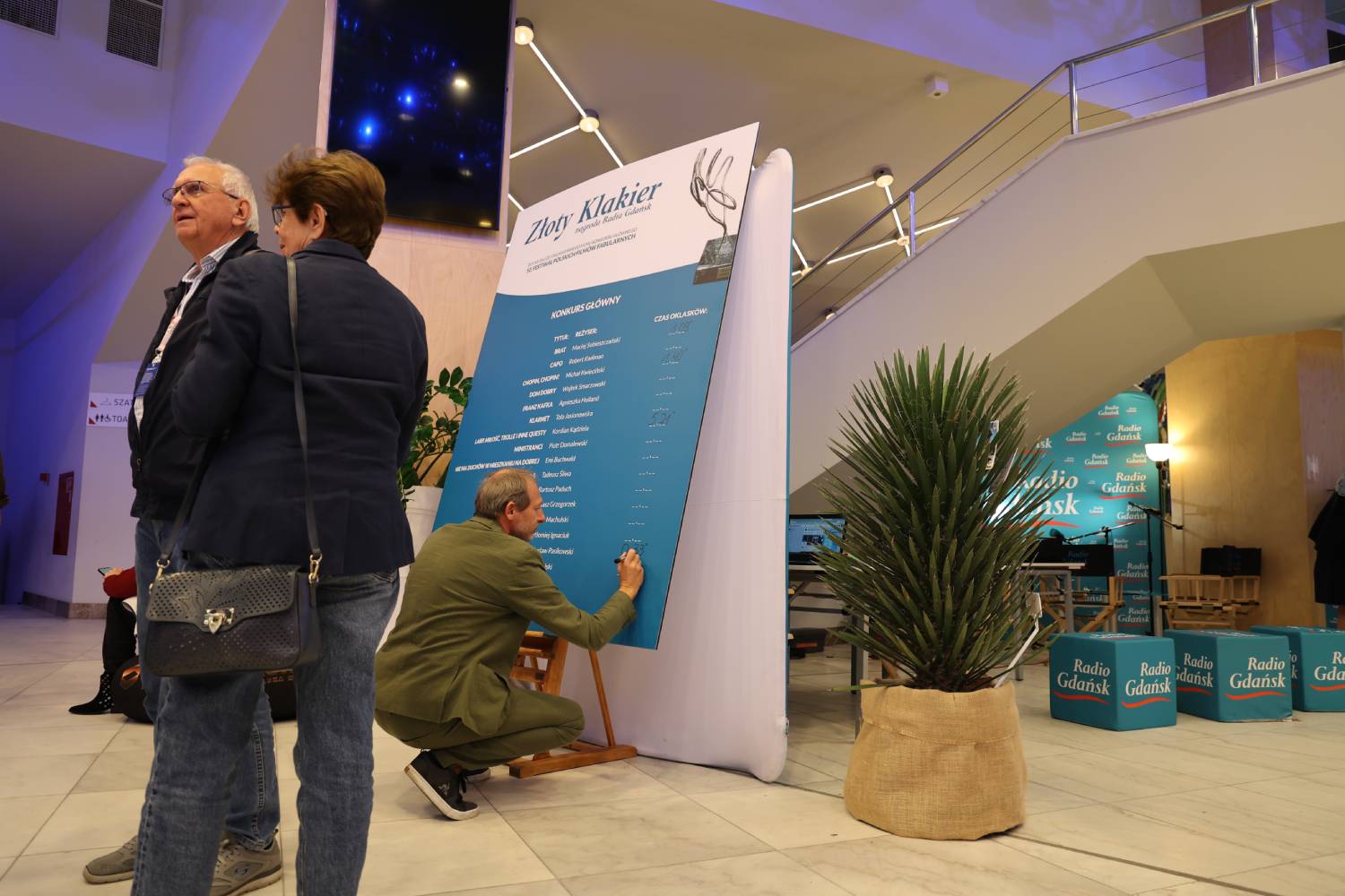 Dumni faworyci przy tablicy wyników "Złotego Klakiera". 50. FPFF w Gdyni, 23.09.2025 r. (fot. Radio Gdańsk/Piotr Puchalski)