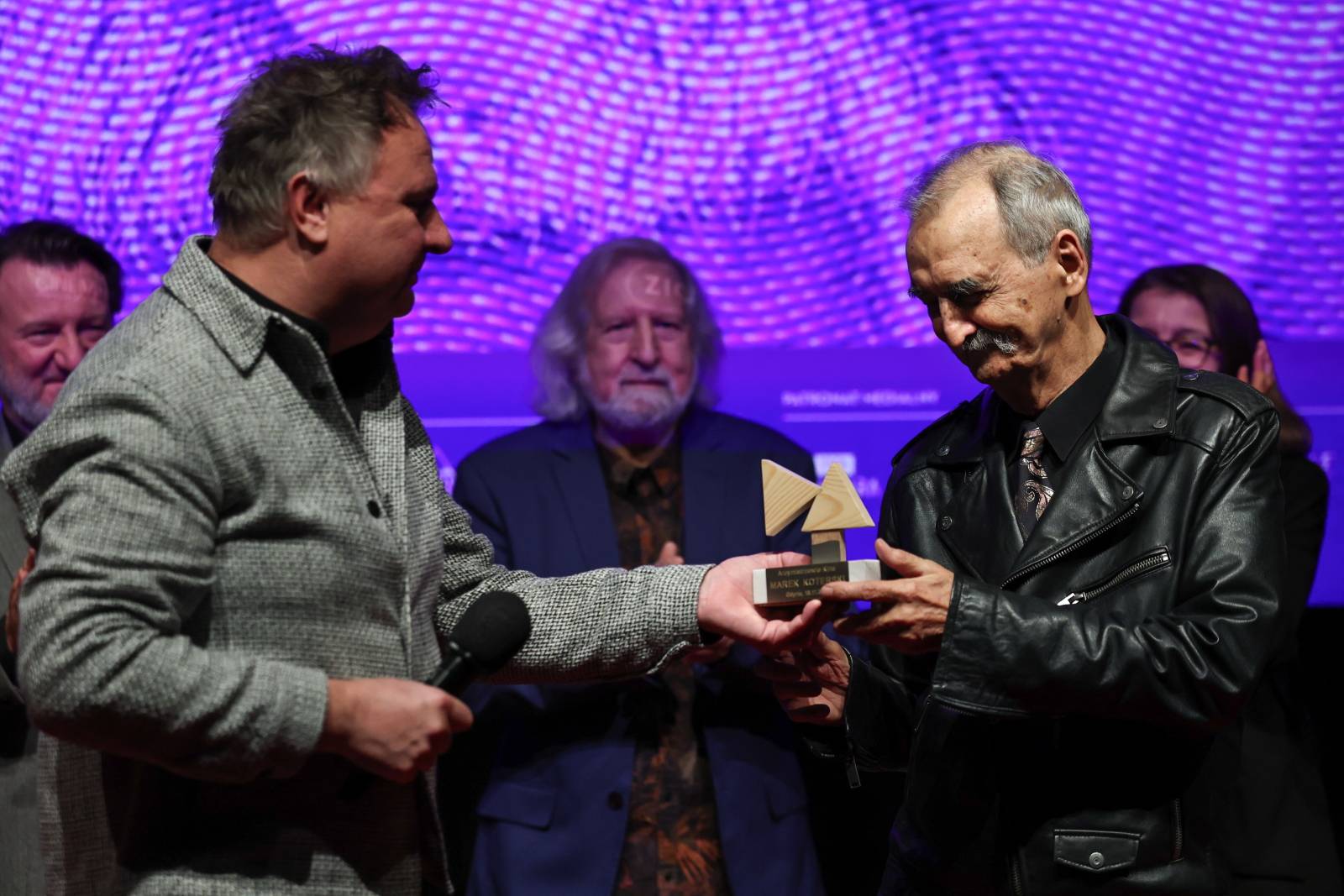 Reżyser Marek Koterski (P) odebrał nagrodę Arcymistrza Kina, 16 bm. podczas Festiwalu Arcymistrzowie Kina w Gdyni. Nagrodę wręcza dyrektor Gdyńskiego Centrum Filmowego Jerzy Rados. Gdynia, 16.11.2025 r.(PAP/Adam Warżawa)