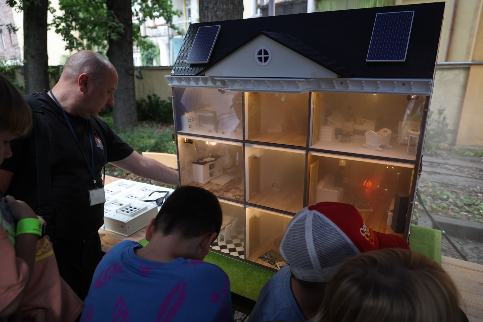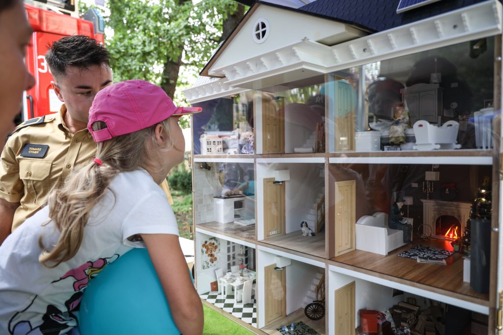 – Dziś z nami jest gaśniczy wóz, przedstawia przede wszystkim sprzęt, który znajduje się na wyposażeniu jednostek ratowniczo-gaśniczych. Moi koledzy, którzy właśnie teraz prezentują wyposażenie oraz działanie wozu gaśniczego, opowiadają i odpowiadają na pytania, które czasami są trudne, ale nasza młodzież jest w dzisiejszych czasach bardzo wyedukowana. Przywiozłem ze sobą mobilny symulator zagrożeń pożarowych. Przedstawia on budynek jednorodzinny, który jest podobny do domku dla lalek dla dzieci, jednak mogą się nim zainteresować starsi – wyjaśnił Tomasz Cymek.