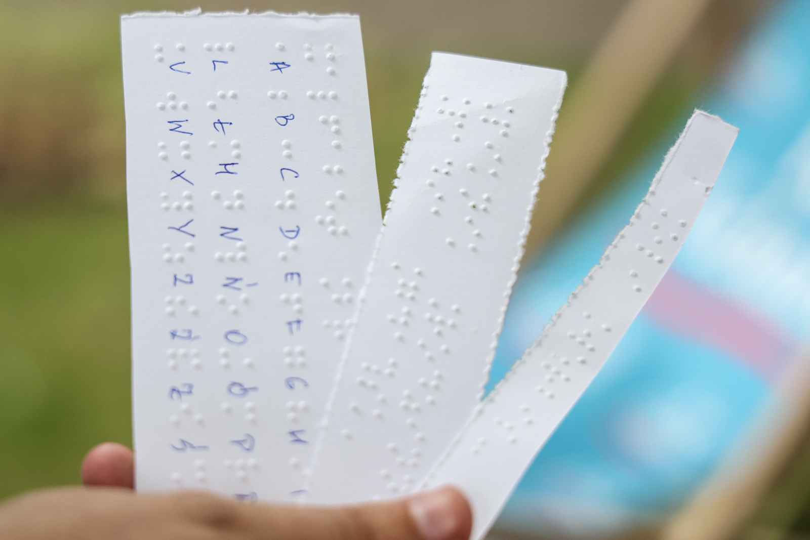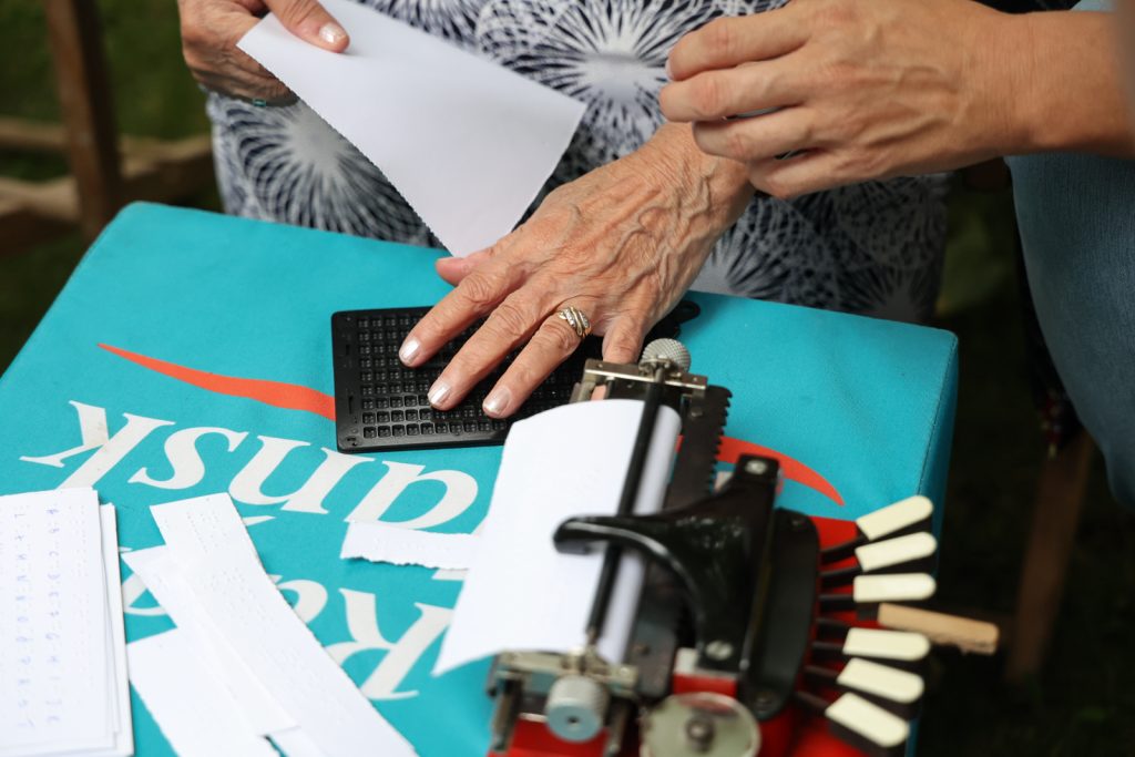 Dzieci i seniorzy – uczestnicy festynu – chcieli dowiedzieć się jak najwięcej na temat alfabetu Braille’a, którym posługują się niewidomi. Jego twórcą był Ludwik Braille. Ponieważ jako trzyletni chłopiec stracił wzrok, bardzo ubolewał nad tym, że nie ma możliwości porozumiewania się ze światem wiedzy. Wymyślił sposób, który do dziś nie ma lepszego, jeśli nie liczyć nowoczesnych technologii. Pismo, które stworzył, opiera się na tak zwanym sześciopunkcie składającym się z dwóch kolumn po trzy punkty w każdej. W obrębie tego sześciopunktu znajdują się wszystkie litery alfabetu, znaki matematyczne, a także nuty.