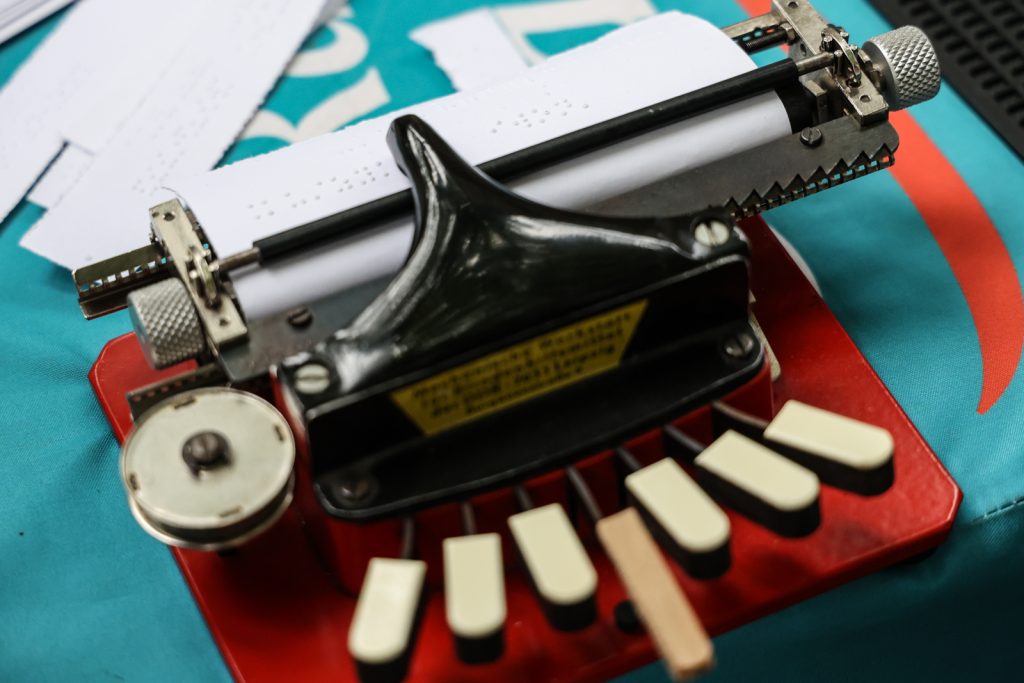 – Istnieje też pełna wersja stenotypii, która przydaje się szczególnie, gdy mamy mało kartek papieru, a sporo do napisania. Pismo punktowe Braille’a bowiem zajmuje dużo miejsca i tak na przykład jeden tom książki wydanej normalnym drukiem to cztery tomy w Braille’u – opowiadała pani Helena.