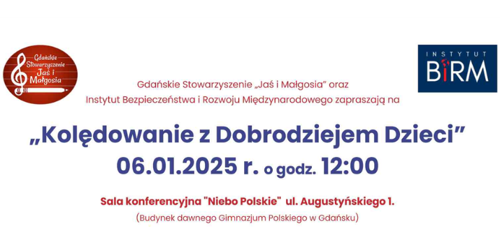Koncert „Kolędowanie z Dobrodziejem Dzieci” organizowany przez Gdańskie Stowarzyszenie „Jaś i Małgosia” oraz Fundację Instytut Bezpieczeństwa i Rozwoju Międzynarodowego odbędzie się 6 stycznia 2025 r. o godz. 12:00 w Gdańsku, w Sali Konferencyjnej Niebo Polskie.