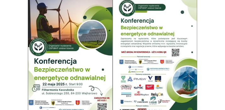 Ogólnopolskie Stowarzyszenie pracowników Służby Bezpieczeństwa i Higieny Pracy Oddział w Gdańsku zaprasza na Konferencje pt. „Bezpieczeństwo e energetyce odnawialnej”, która odbędzie się w dniu 22 maja 2025 r. w Filharmonii Kaszubskiej w Wejherowie.