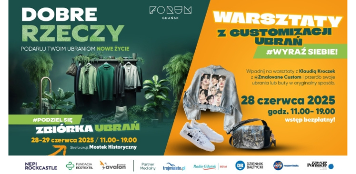 W Forum Gdańsk 28 i 29 czerwca (sobota i niedziela handlowa) odbędzie się akcja „DOBRE RZECZY”. Zebrane ubrania i inne materiały trafią do drugiego obiegu lub do recyklingu. Za każde przekazane dwa kilogramy złotówka trafi do Fundacji Avalon na zakup sprzętu rehabilitacyjnego dla osób z niepełnosprawnościami. Dodatkową atrakcją będą bezpłatne, kreatywne warsztaty z customizacji odzieży. To okazja do przedwakacyjnego przeglądu szafy, a także szansa na kreatywne spędzenie czasu i nadanie drugiego życia swoim ubraniom.