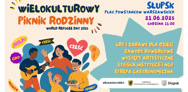 Zapraszamy do wzięcia udziału w Wielokulturowym Pikniku Rodzinnym. World Refugee Day 2025. Organizatorami Pikniku z okazji World Refugee Day 2025 są Samorząd Województwa Pomorskiego oraz Miasto Słupsk, ale w rzeczywistości to efekt współpracy wielu organizacji pozarządowych i partnerów instytucjonalnych. To wspólna inicjatywa na rzecz integracji lokalnej społeczności, a także osób z doświadczeniem migracyjnym. Piknik odbędzie się 21 czerwca 2025 r. (sobota) na Placu Powstańców Warszawskich w Słupsku w godz. 11.00 – 17.00. Wstęp bezpłatny.