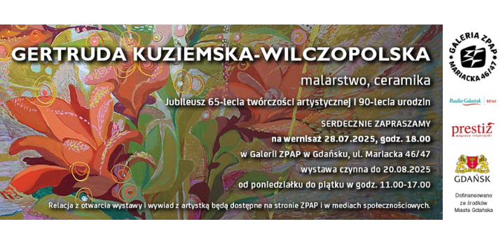 28 lipca 2025 r. /poniedziałek/ o godz. 18.00 w Galerii ZPAP przy ul.Mariackiej 46/47 w Gdańsku, zostanie otwarta jubileuszowa wystawa malarstwa i ceramiki Gertrudy Kuziemskiej – Wilczopolskiej. Wystawa czynna od 28 lipca do 20 sierpnia 2025 r. , od poniedziałku do piątku , w godz. 11.00-17.00. Wstęp wolny.