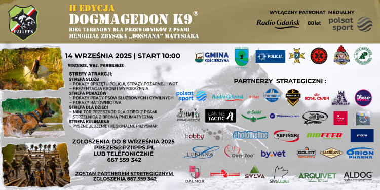 Już 14 września we Wdzydzach czeka na Was wyjątkowe wydarzenie – Dogmagedon K9 – Memoriał Zbyszka „Bosmana” Matysiaka. Start biegu punktualnie o godzinie 10:00 na gminnym boisku. To ekstremalny bieg terenowy z psami – zarówno służbowymi, jak i cywilnymi. Trasa naszpikowana przeszkodami, wodą, błotem i wymagającymi zadaniami sprawdzi kondycję, odwagę oraz niezwykłą więź między przewodnikiem a jego czworonożnym partnerem. Ale Dogmagedon to coś więcej niż rywalizacja – to także wielki piknik rodzinny pod hasłem „Wstęp do służby”! Na miejscu zobaczycie sprzęt wykorzystywany przez różne służby, czekają Was pokazy psów służbowych, atrakcje i animacje dla najmłodszych, a także coś wyjątkowego – tor przeszkód dla dzieci z psami. Do tego strefa gastronomiczna i możliwość rozmowy z przewodnikami i instruktorami, którzy na co dzień pracują z psami w służbach mundurowych. Zapisy do biegu trwają tylko do 8 września – nie zwlekajcie, liczba miejsc jest ograniczona. Szczegóły, regulamin i formularz zgłoszeniowy znajdziecie na Facebooku – na profilu Dogmagedon K9.