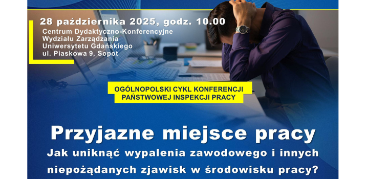 Zjawiska mobbingu, wypalenia zawodowego i inne negatywne czynniki psychospołeczne stanowią poważne problemy w środowisku pracy, dlatego też istnieje potrzeba ciągłego i skutecznego reagowania na zagrożenia. Okręgowy Inspektorat Pracy w Gdańsku oraz Uniwersytet Gdański 28 października 2025 r. organizują konferencję „Przyjazne miejsce pracy. Jak uniknąć wypalenia zawodowego i innych niepożądanych zjawisk w środowisku pracy?” Spotkanie odbędzie się w Centrum Dydaktyczno-Konferencyjnym Wydziału Zarządzania Uniwersytetu Gdańskiego przy ul. Piaskowej 9 Sopocie.