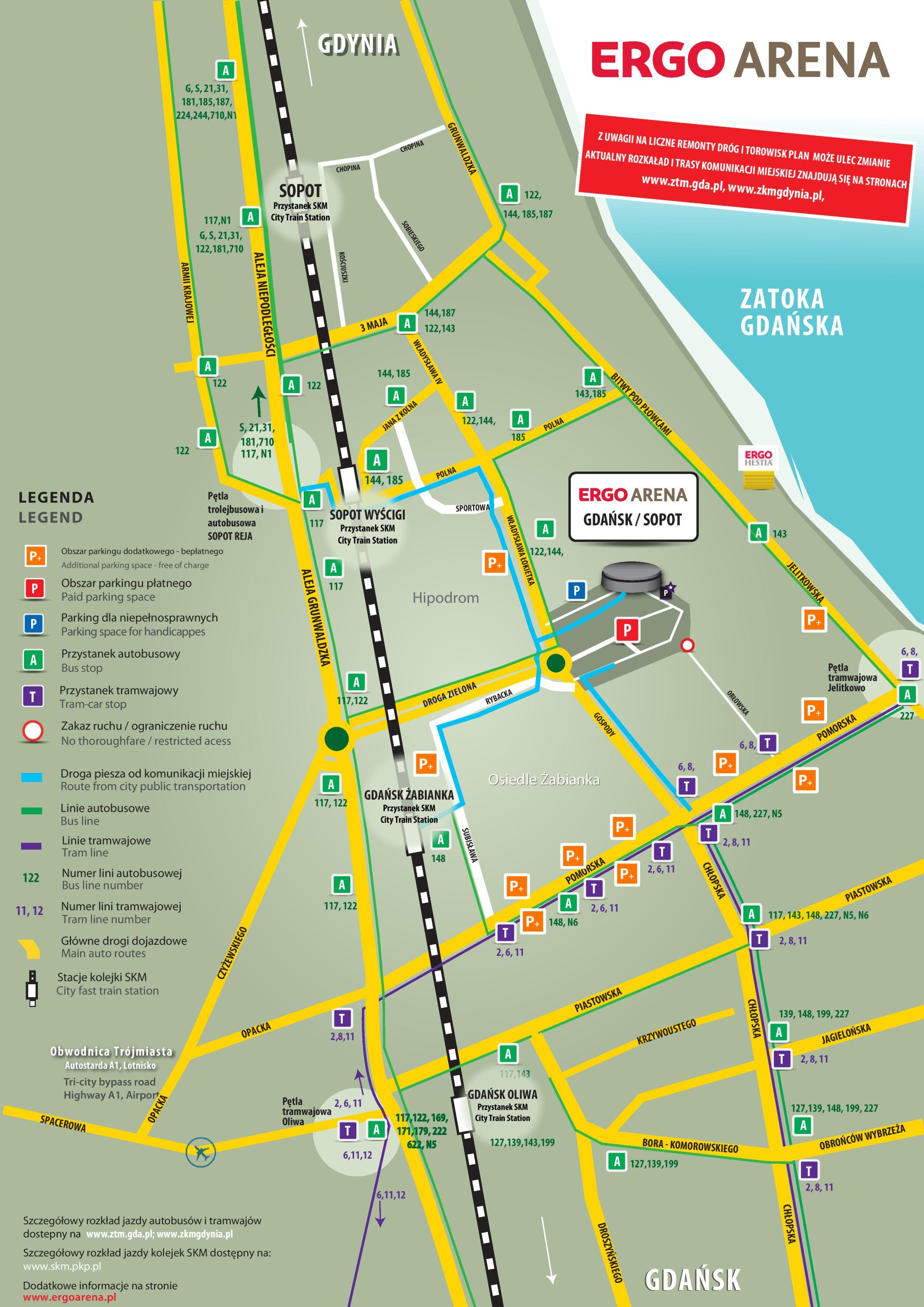 Do dyspozycji użytkowników samochodów będzie dostępne kilka parkingów. W trosce o zapewnienie komfortu widzów wybierających się do Ergo Areny informujemy, że tego dnia dedykowany wjazd na parking przy hali od strony Gdańska to Droga Zielona. Od strony Sopotu dojazd możliwy będzie ulicą Łokietka, jak również Drogą Zieloną.