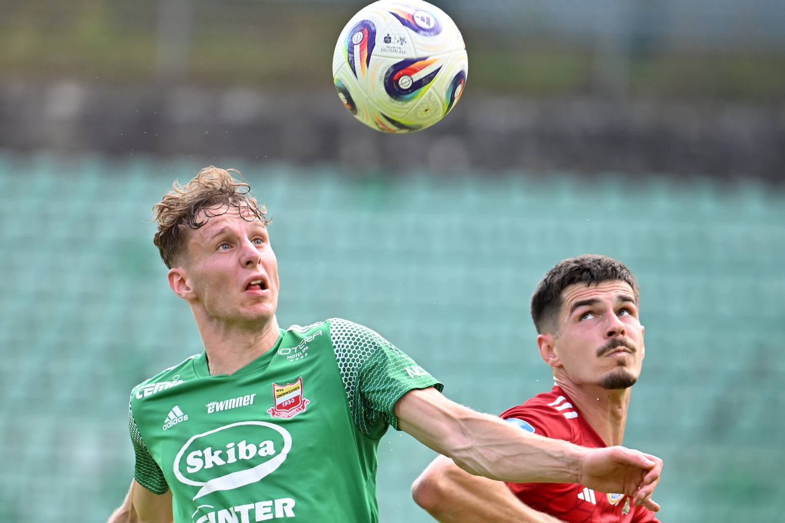 Zawodnik Lechii Gdańsk Matus Vojtko (P) i Jakub Pławski (L) z Chojniczanki Chojnice podczas meczu kontrolnego. Gdańsk, 13.07.2025 r. (fot. PAP/Marcin Gadomski)