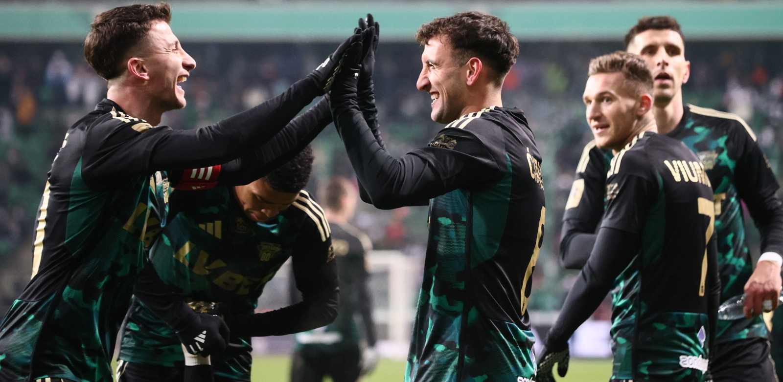 Zawodnicy Lechii Gdańsk Rifat Kapic (L) i Aleksandar Cirkovic (C) cieszą się z bramki zdobytej na 1: 2 w meczu 16. kolejki piłkarskiej Ekstraklasy z Legią Warszawa. Warszawa, 22.11.2025 r. (fot. PAP/Leszek Szymański)