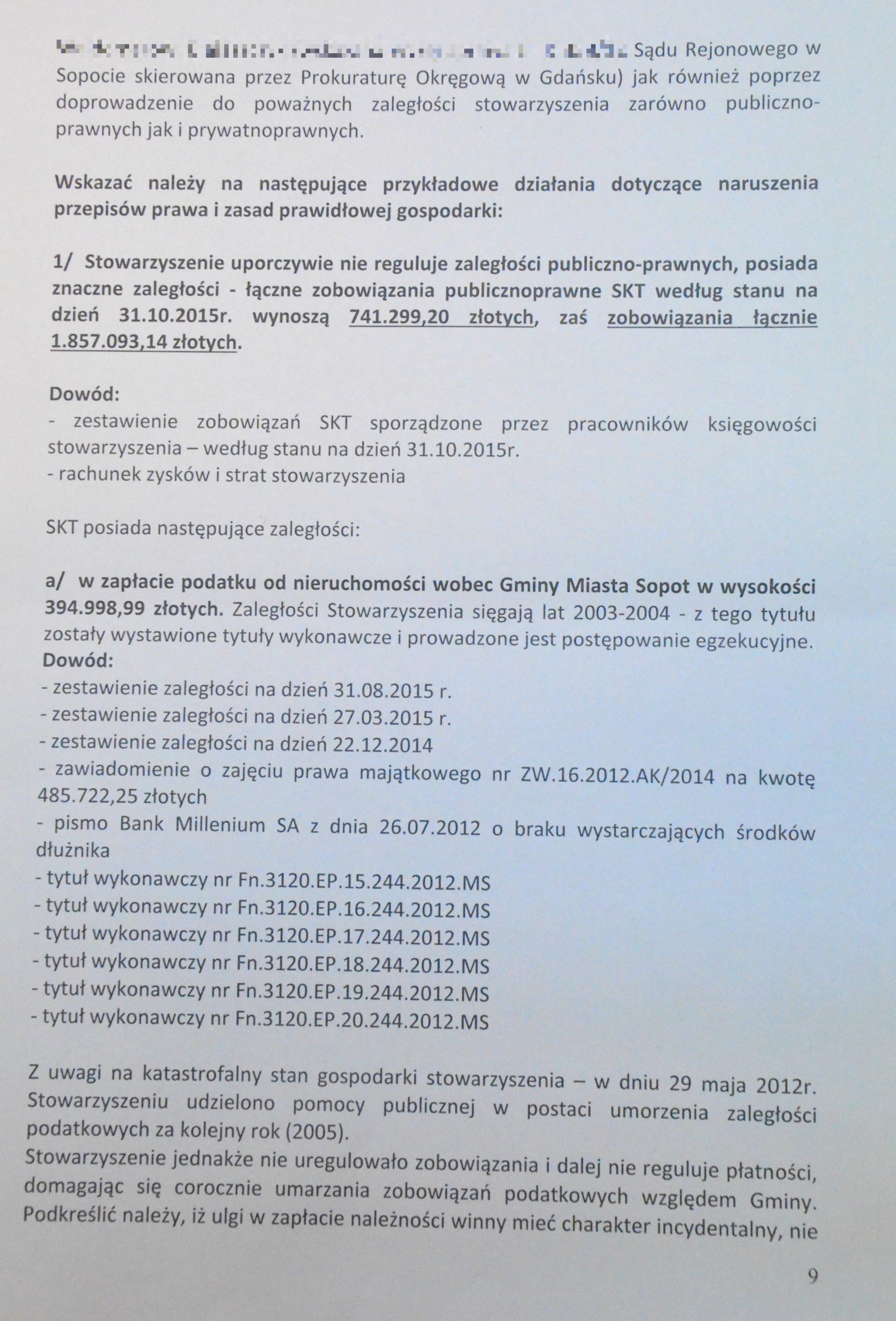 – Pobraliśmy z klubu zaliczki, ponieważ na wniosek prezydenta Sopotu konto klubu zostało zablokowane. Aby SKT mogło działać potrzebowaliśmy pieniędzy. Środki, o których mowa zostały wpłacone na konto jednej z firm, wobec których stowarzyszenie miało należność – tłumaczy Waldemar Białaszczyk. Tymczasem zdaniem Wiesława Pedrycza „nie ma jakichkolwiek dokumentów księgowych, które miałyby potwierdzać konieczność dokonywania jakichkolwiek wpłat na rzecz powyższego podmiotu”.