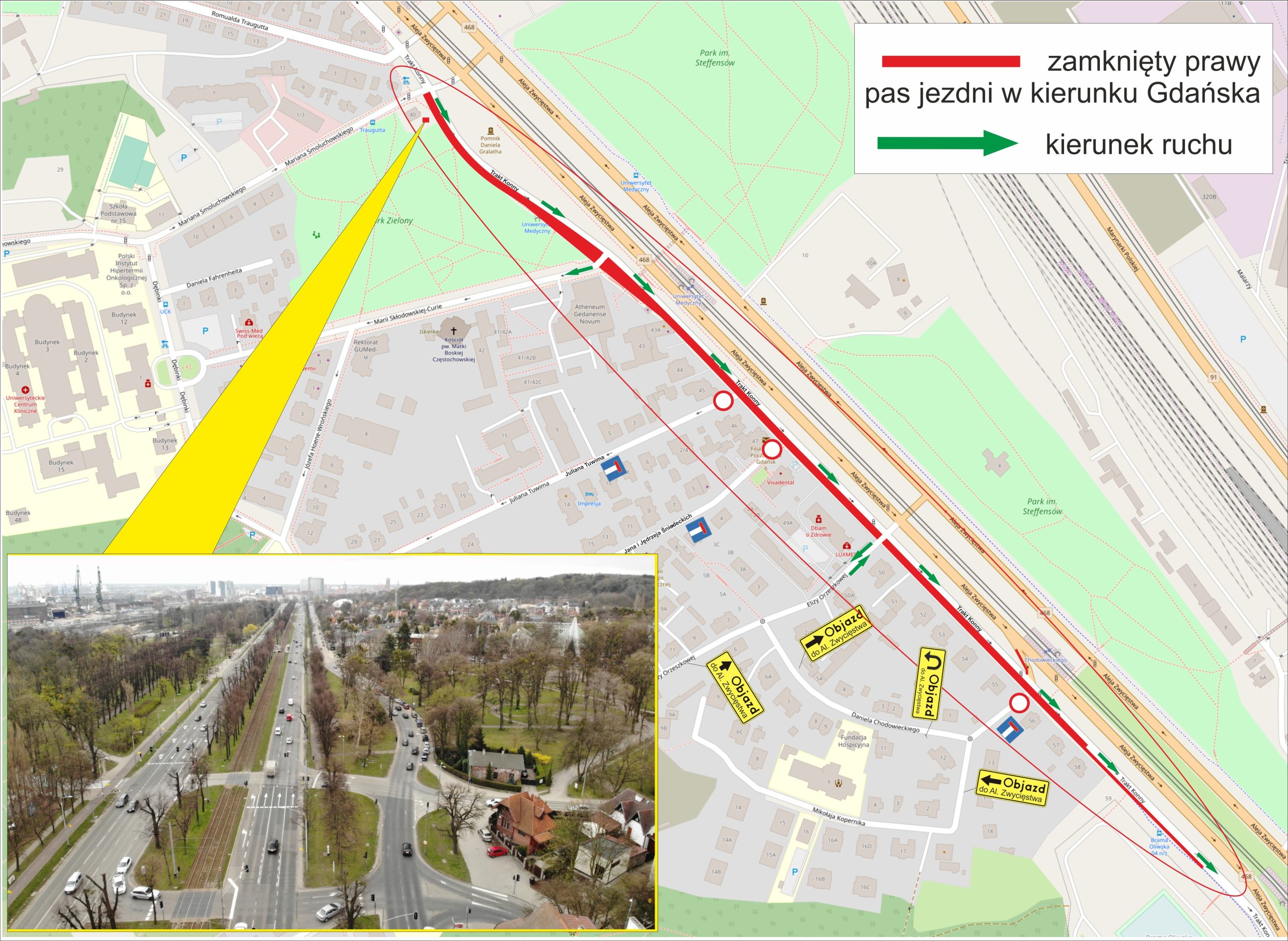 Od wtorkowego (23 kwietnia) poranka na kierowców czekają utrudnienia na Trakcie Konnym, ulicy równoległej do Al. Zwycięstwa, prowadzącej do centrum Gdańska. Drogowcy zwężyli jezdnię z dwóch do jednego pasa na kilometrowym odcinku od ul. Smoluchowskiego do ul. Chodowieckiego.