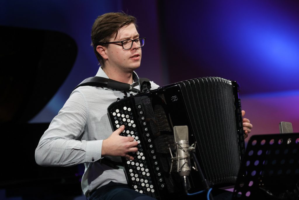 Grający na akordeonie Jakub Stefaniak ukończył z wyróżnieniem Akademię Muzyczną imienia Karola Szymanowskiego w Katowicach, a obecnie robi doktorat na Akademii Muzycznej w Gdańsku. Występował na międzynarodowych i ogólnopolskich konkursach, do swoich ważniejszych osiągnięć może zaliczyć drugie nagrody IX Międzynarodowego Konkursu Akordeonowego w szwajcarskim Reinach i V Międzynarodowych Dni Akordeonu w czeskiej Pradze oraz III nagrodę XXXIX Międzynarodowego Festiwalu Muzyki Akordeonowej „Citta di Castelfidardo” we Włoszech w kategorii zespołów kameralnych. Jest też laureatem między innymi programu stypendialnego „Młoda Polska” oraz stypendiów Ministra Kultury, Dziedzictwa Narodowego i Sportu. Podczas koncertu zaprezentował „Sonatę nr 1 ku pamięci Olivera Messiaena” Piotra Sławińskiego („Énglise de la Sainte-Trinite de Paris”, „Preyer” i „Scherzo”), „Preludium” i „Fugę Fis-dur BWV 858” Jana Sebastiana Bacha, „Les Sauvages” Jeana-Philippe’a Rameau, „ACC-3” Krzysztofa Olczaka oraz „Kaprys nr 1” Pawła Sławińskiego.