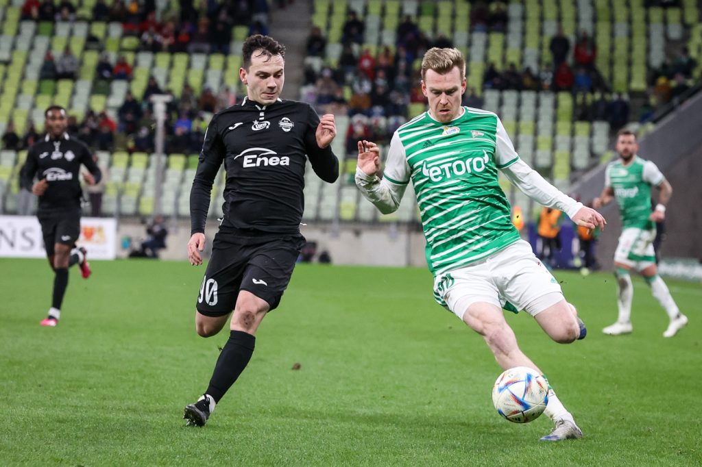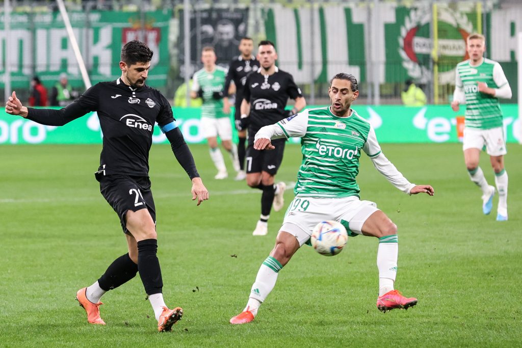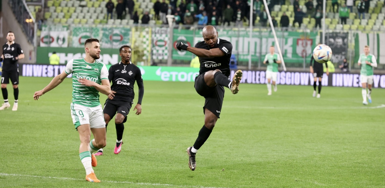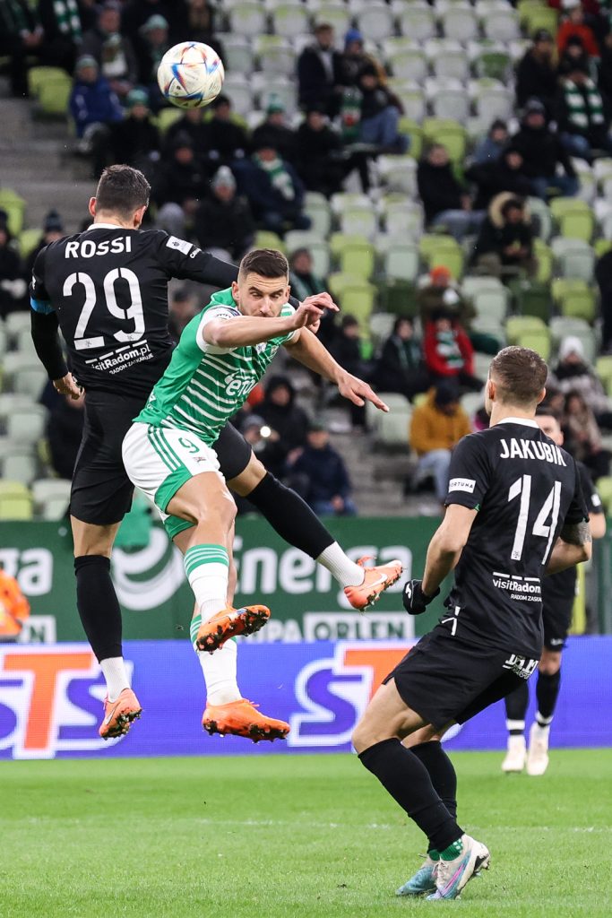 W 21. minucie Michał Nalepa zaliczył fatalną stratę, Radomiak ruszył prawą stroną, a dośrodkowanie Lisandro Semedo wykończył głową Leonardo Rocha. Biało-zieloni kompletnie się pogubili. Radomiak czekał na kontry, ale też przy piłce mógł się podobać, zwłaszcza Alberto Cayarga. I to po jego dośrodkowaniu z rzutu rożnego goście podwyższyli. W polu karnym zamieszanie było spore, a najbardziej pazerny okazał się Dawid Abramowicz.