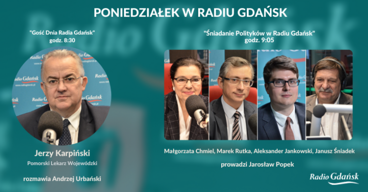Po godzinie 9:00, w audycji “Śniadanie Polityków w Radiu Gdańsk”, spotkają się posłanka Platformy Obywatelskiej Małgorzata Chmiel, poseł Prawa i Sprawiedliwości Janusz Śniadek, wicewojewoda pomorski Aleksander Jankowski oraz poseł Nowej Lewicy Marek Rutka. Politycy omówią bieżące wydarzenia polityczne w kraju i na świecie, a dyskusję poprowadzi Jarosław Popek.