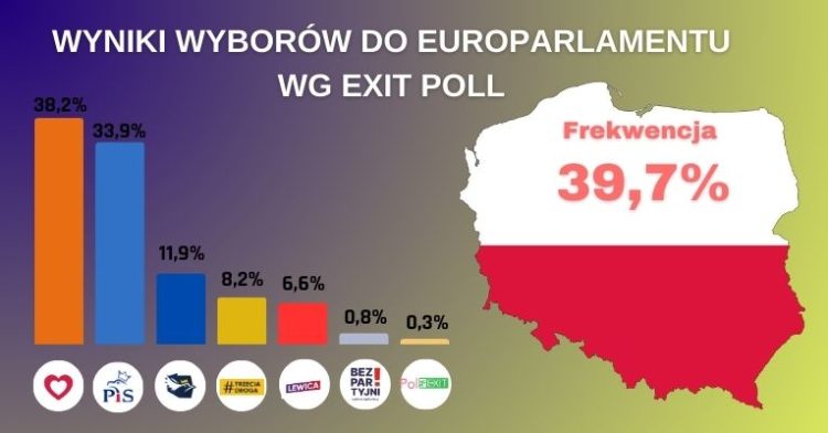 W wyborach do Parlamentu Europejskiego Polacy wybierali 53 europosłów spośród ponad tysiąca kandydatów. Z sondażu exit poll wynika, że KO zdobyła 21 mandatów, PiS – 19, Konfederacja – 6, Trzecia Droga (PSL i Polska 2050) – 4, a Lewica – 3.