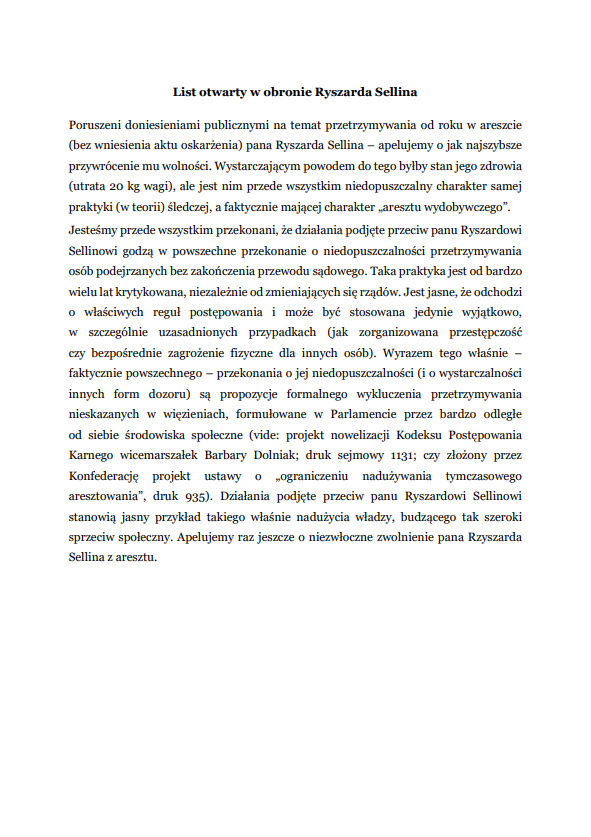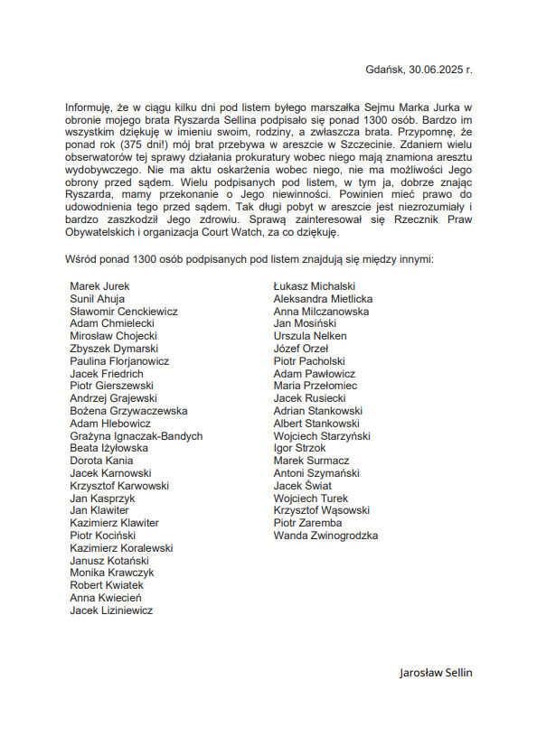 Jarosław Sellin w dokumencie podkreślił, że on i wielu innych podpisanych pod listem ma przekonanie o niewinności brata. Dotychczas były minister nie został przesłuchany. Nie ma aktu oskarżenia, nie ma możliwości obrony przed sądem.
