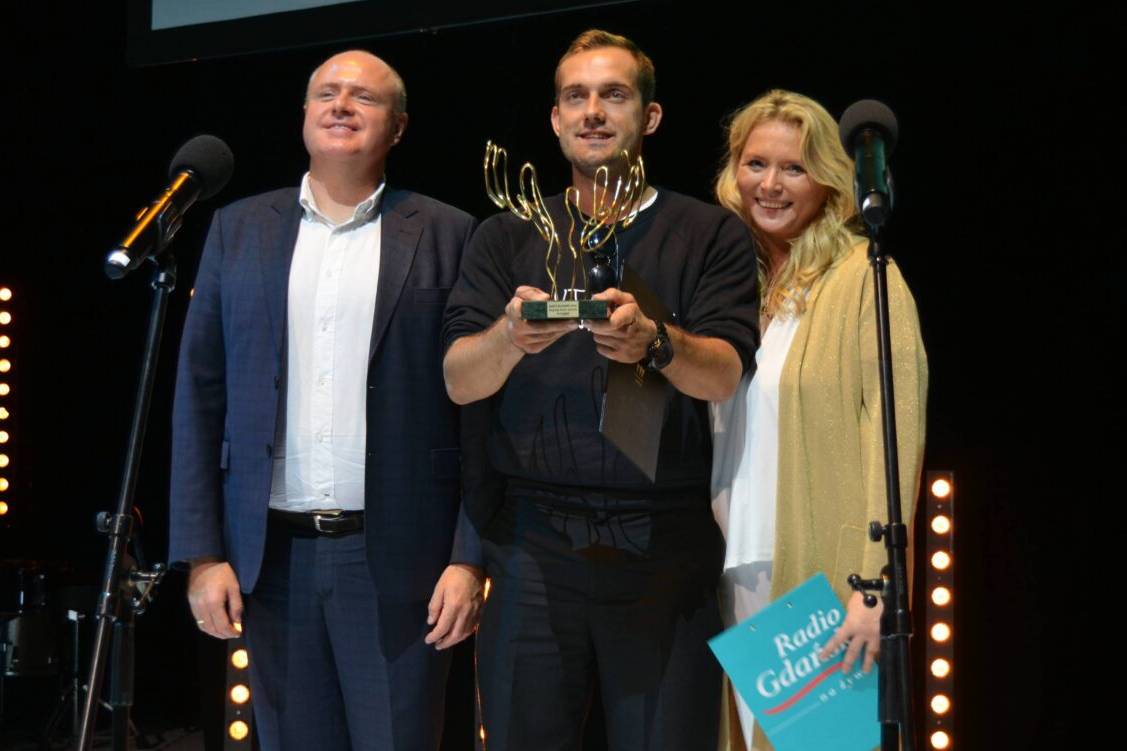 Korek Bojanowski, reżyser filmu „Utrata równowagi” ze „Złotym Klakierem” Radia Gdańsk. Nagrodę wręczali kierujący Radiem Gdańsk Krzysztof Lodziński oraz sekretarz programu Beata Gwoździewicz (fot. Radio Gdańsk/Piotr Puchalski)