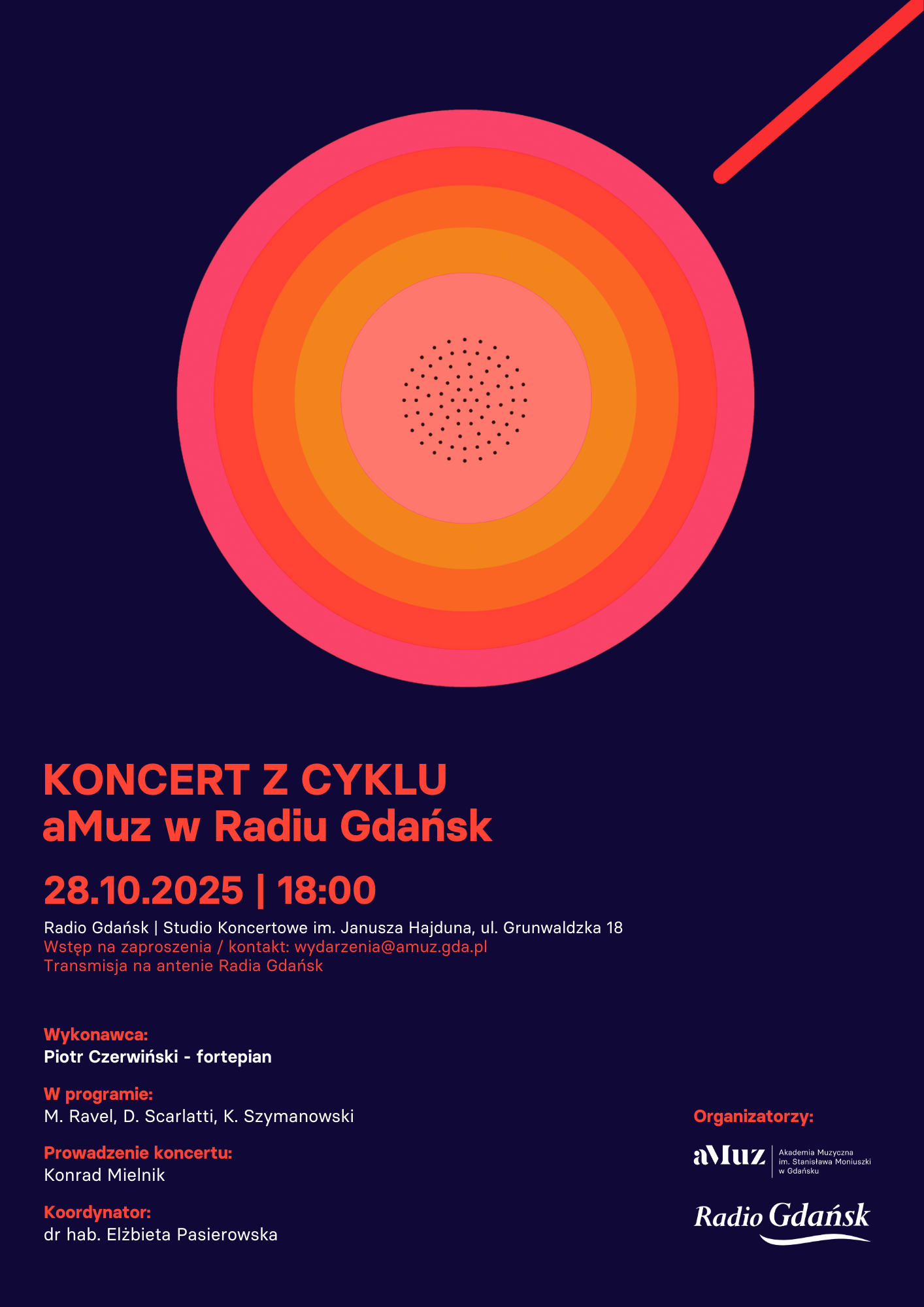 Wystąpi Piotr Czerwiński, który na fortepianie wykona utwory artystów takich, jak: M. Ravel, D. Scarlatti i K. Szymanowski. Koncert poprowadzi Konrad Mielnik.