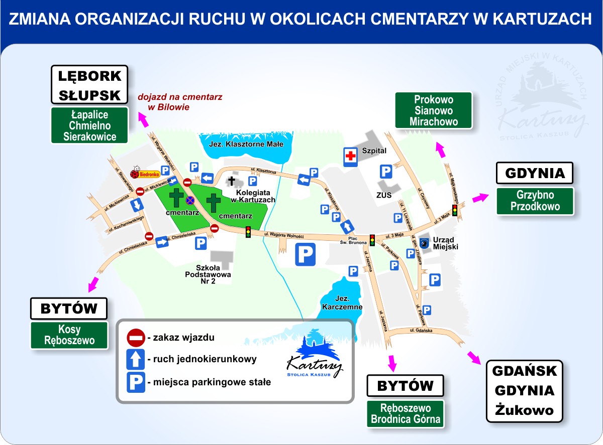 W dniach 31 października – 2 listopada w obrębie cmentarzy przy ul. Wzgórze Wolności w Kartuzach oraz przy cmentarzu w Bilowie będą obowiązywać zmiany organizacji ruchu drogowego.