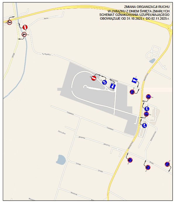 W rejonie cmentarza parafialnego w Żukowie wprowadzony zostanie ruch jednokierunkowy na odcinku od skrzyżowania z ul. Pod Otomino do skrzyżowania z odnogą ul. 3 Maja (za cmentarzem, patrząc od strony Kościerzyny).