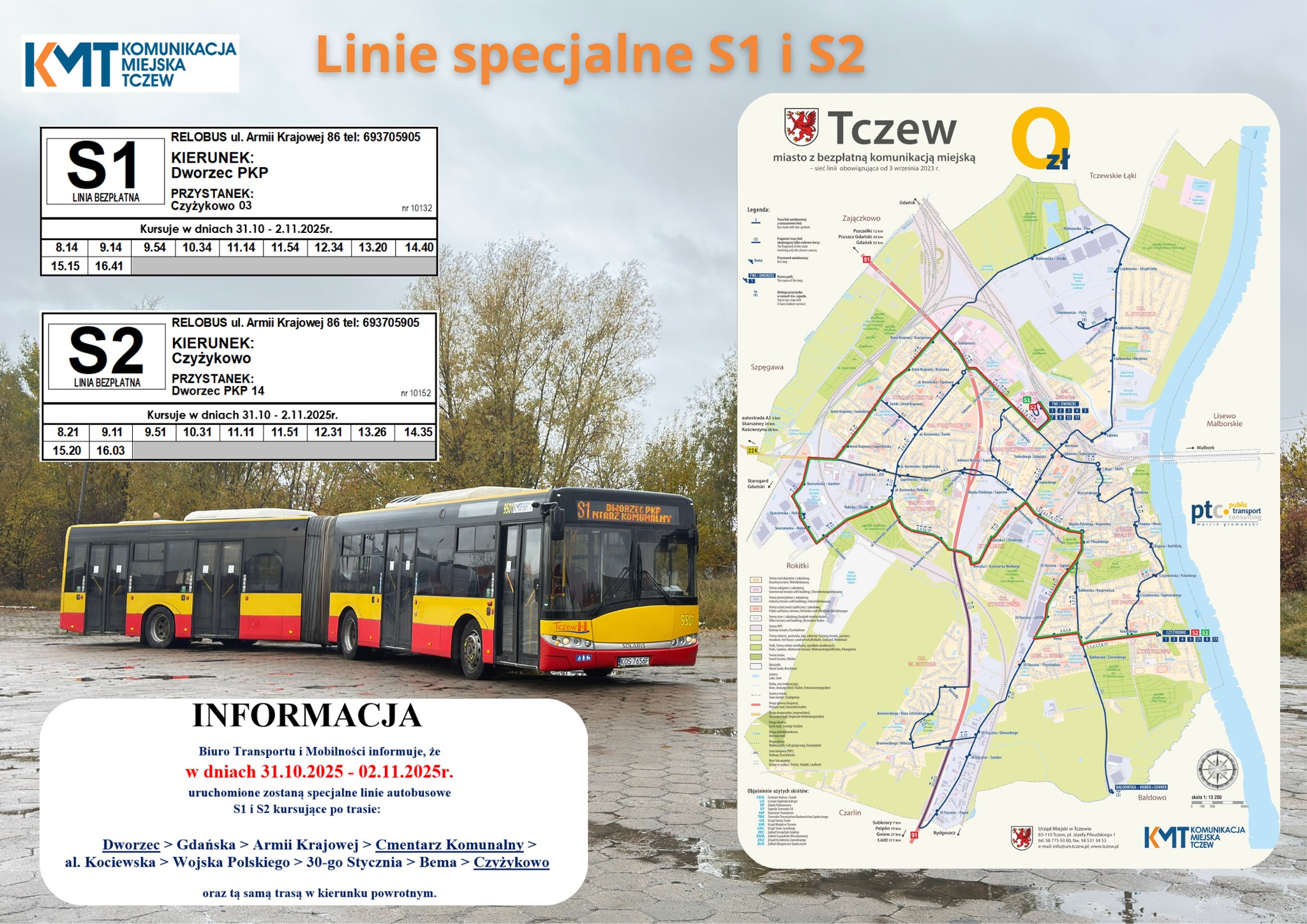 Miasto Tczew zachęca do korzystania z bezpłatnej komunikacji miejskiej i informuje o specjalnych liniach autobusowych S1 i S2, które kursują do 2 listopada.