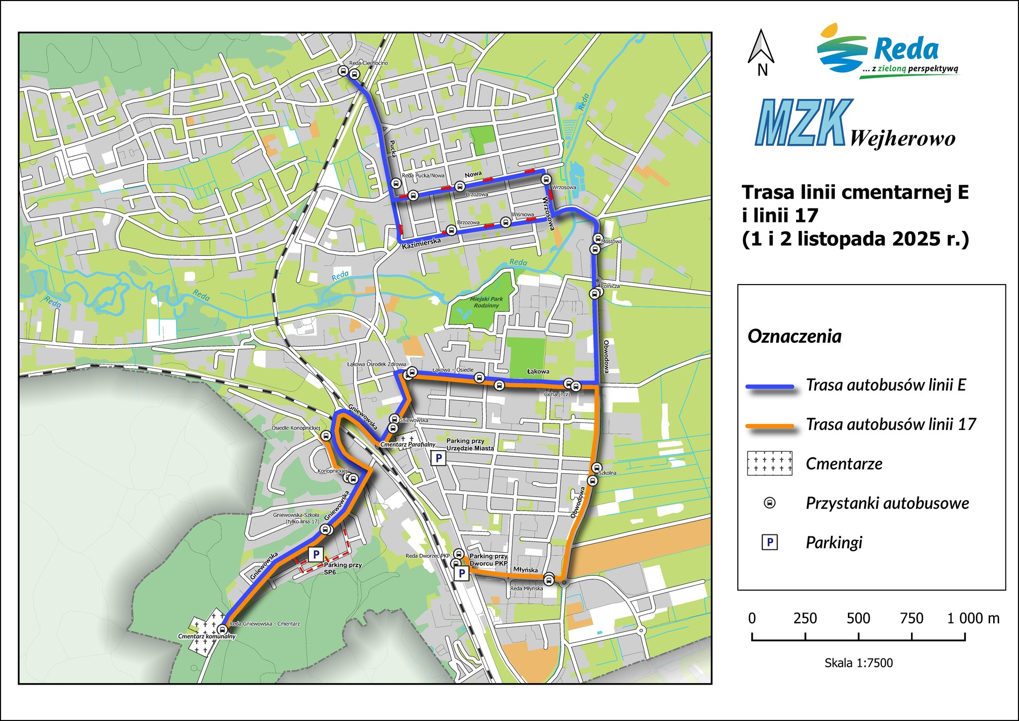 1 listopada MZK Wejherowo uruchomi dodatkową linię cmentarną E na trasie Reda Ciechocino – Reda Gniewowska – Cmentarz. Autobusy będą zatrzymywać się na wszystkich przystankach między Ciechocinem a przystankiem Gniewowska, skąd będą kursować bez zatrzymania bezpośrednio pod bramę cmentarza. Kursowanie linii zaplanowano nie rzadziej niż co 30 minut w godzinach 8:30 – 12:00 i co godzinę w godzinach 12:00 – 17:30. Oprócz tego na linii 17 zostanie uruchomiony specjalny kurs o 9:26 z przystanku Reda Dworzec PKP do krańca Gniewowska – Cmentarz. W zależności od liczby pasażerów, wybrane kursy mogą być obsługiwane przez dwa pojazdy jednocześnie.