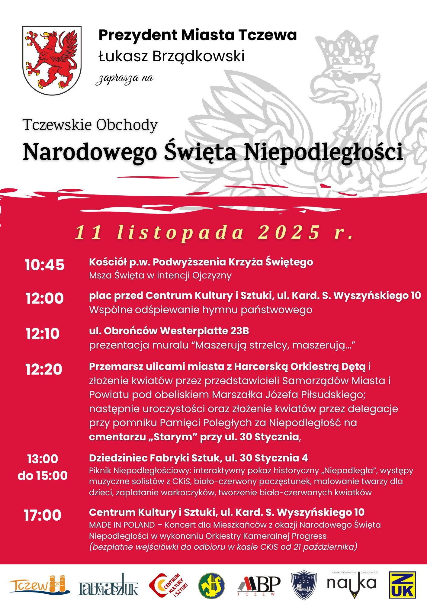 W poniedziałek 10 listopada o godz. 11:00 rozpocznie się uroczystość przy pomniku Józefa Piłsudskiego na Strzyży. W programie m.in. złożenie wieńców i wiązanek kwiatów u stóp pomnika. O tej samej porze na Górze Gradowej mieszkańcom będą rozdawane flagi i kotyliony. Natomiast o 12:30 nastąpi podniesienie flagi narodowej na najwyższy w mieście maszt na Górze Gradowej.