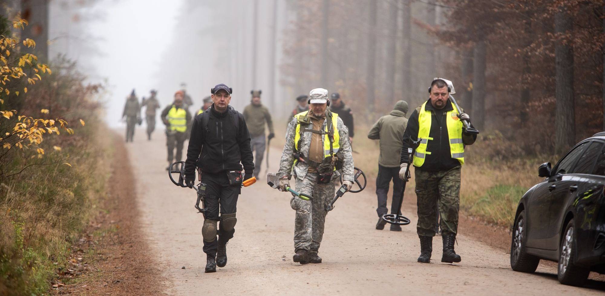 Grupa z wykrywaczami metali podczas badań w Lesie Piaśnickim w listopadzie 2025 r. (fot. IPN)