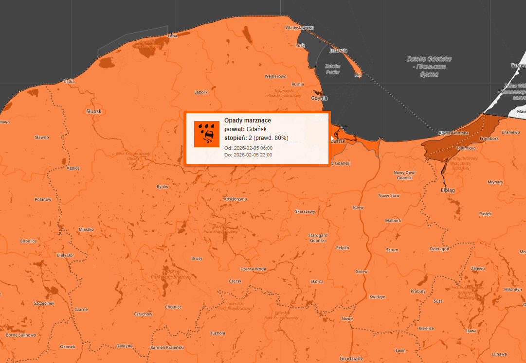 W środę po południu IMGW wydał ostrzeżenie II stopnia przed marznącymi opadami w całym województwie pomorskim. Alert będzie ważny w czwartek od godz. 6:00 do godz. 23:00. Synoptycy zastrzegają jednak, że ostrzeżenie może być kontynuowane.