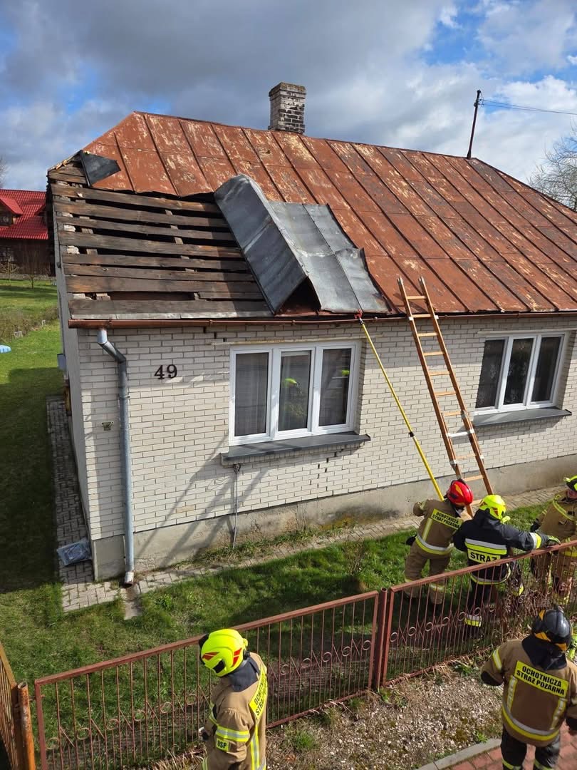 Ratownicy pomagali również mieszkańcom Stężycy, gdzie wiatr zerwał dach z budynków mieszkalnych i gospodarczych.