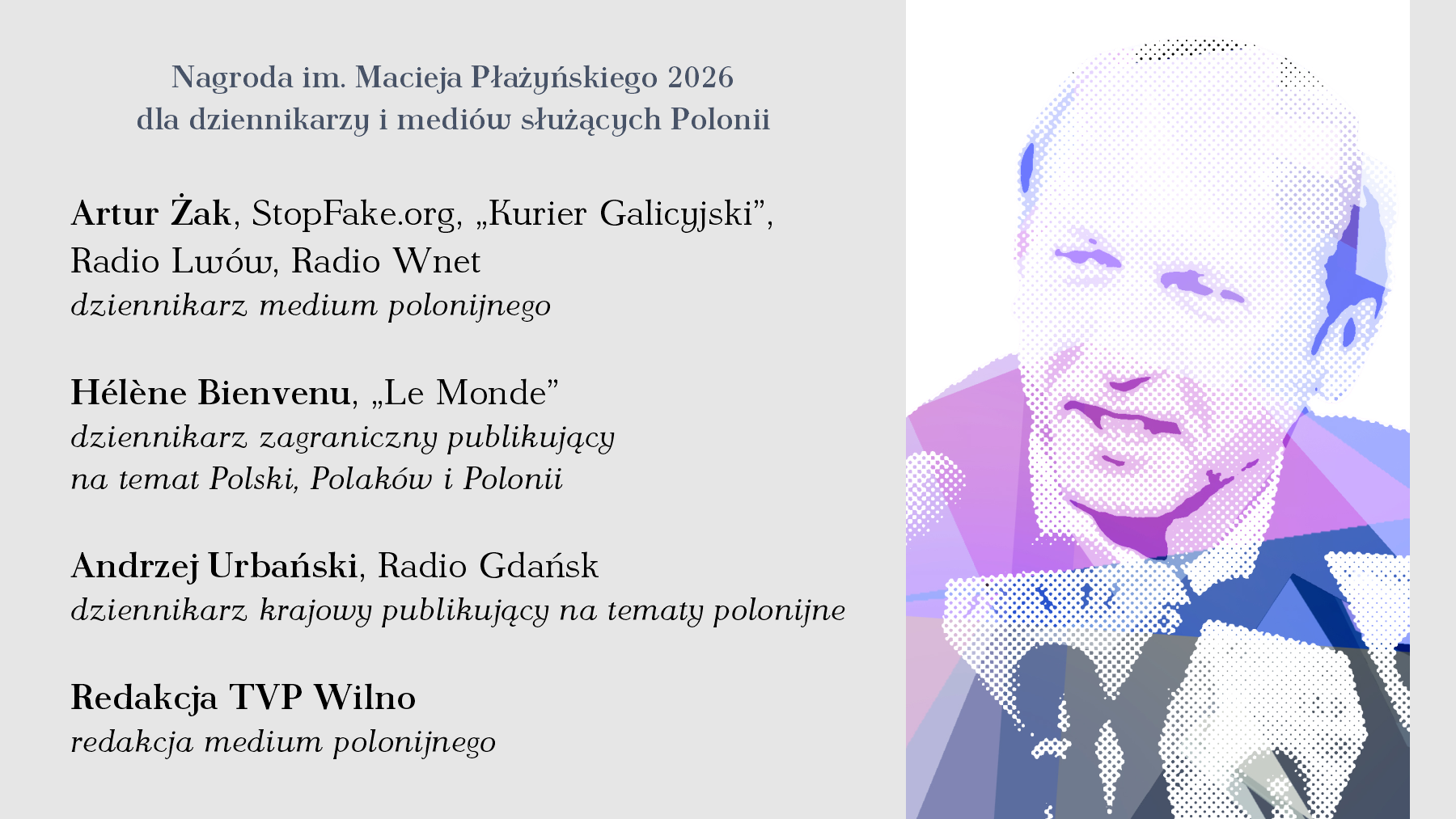 Dziennikarz Radia Gdańsk Andrzej Urbański otrzymał Nagrodę im. Macieja Płażyńskiego 2026 dla dziennikarzy i mediów służących Polonii. Wręczenie nagród odbędzie się 23 maja w Muzeum Emigracji w Gdyni.