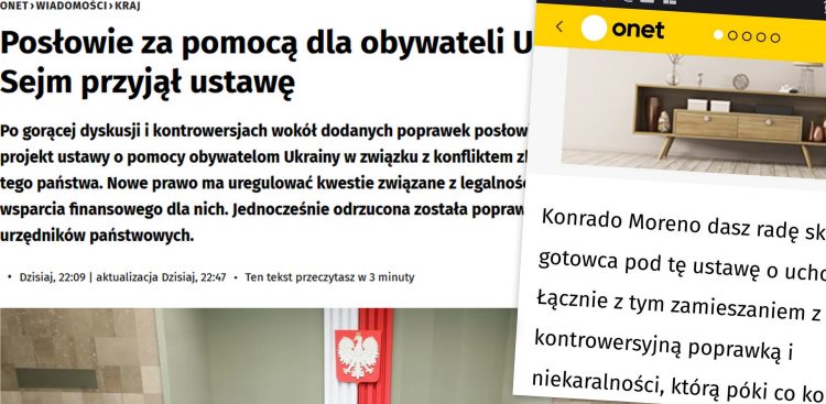 Mowa o artykule pod tytułem „Posłowie za pomocą dla obywateli Ukrainy. Sejm przyjął ustawę”, który na portalu Onet.pl został opublikowany w środę, 9 marca, po godz. 22.00.