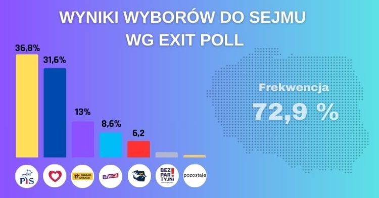 Według opublikowanych o godz. 21:00 wyników exit poll najwięcej głosów w wyborach do Sejmu uzyskało Prawo i Sprawiedliwość. Partia rządząca Polską od 2015 roku uzyskała 36,8 proc. głosów. Na drugim miejscu z 31,6 proc. głosów uplasowała się Koalicja Obywatelska. Do Sejmu wejdą również Trzecia Droga (13 proc. głosów), Lewica (8,6 proc.) i Konfederacja (6,2).
