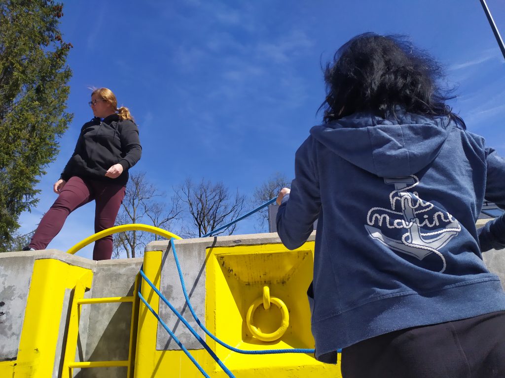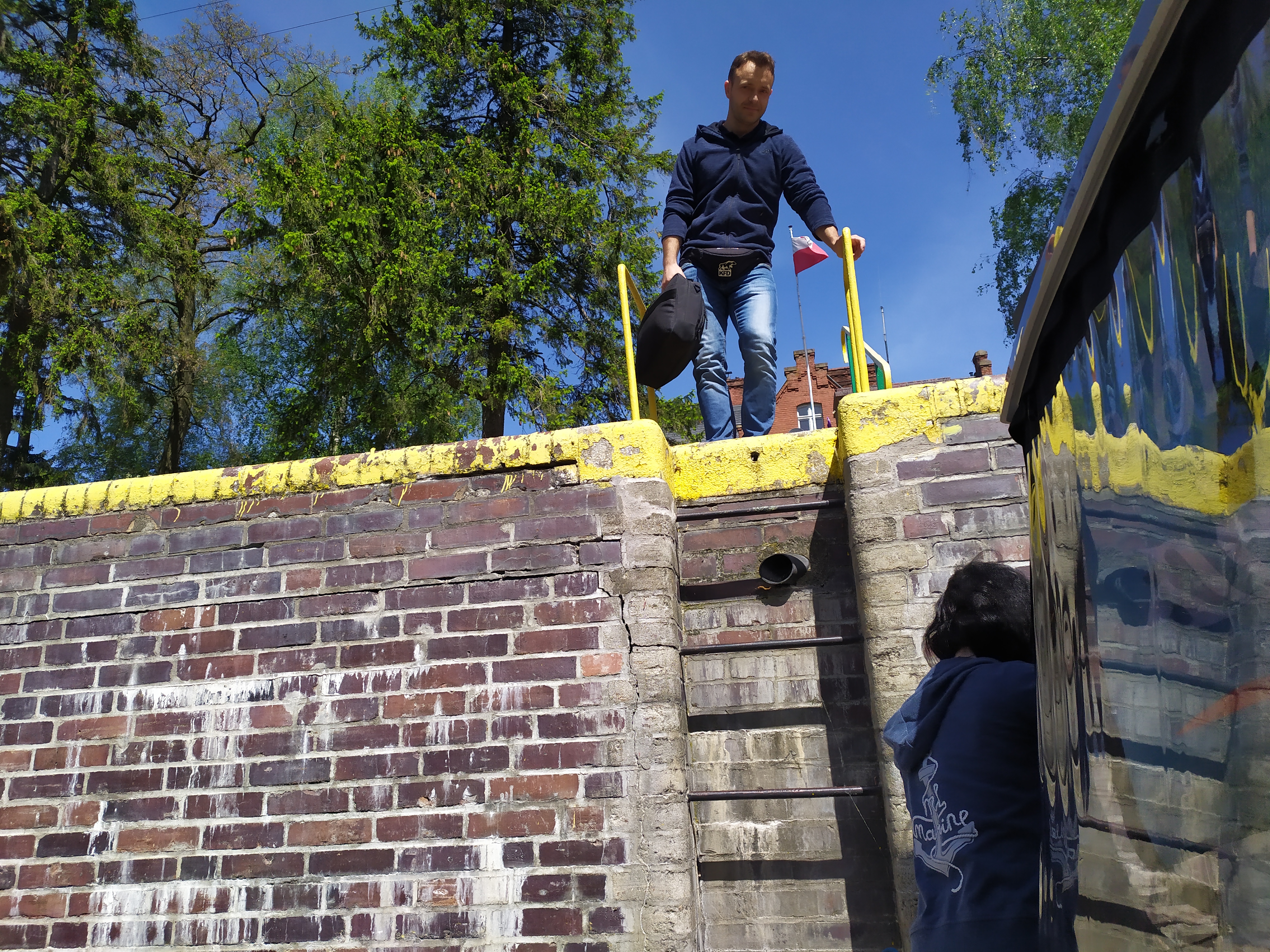 Około godziny 12:00 dotarliśmy do śluzy Gdańska Głowa. Tu pożegnaliśmy się z Tomaszem Wątrobą. Przywitaliśmy natomiast Bartosza Śledzia z Nadzoru Wodnego w Nowym Dworze Gdańskim, który wytłumaczył nam, jakie znaczenie mają wały przeciwpowodziowe, dlaczego nie wolno jeździć na nich na rowerze, z jakiego rodzaju ziemi są budowane i co można wyciągnąć z rzeki.