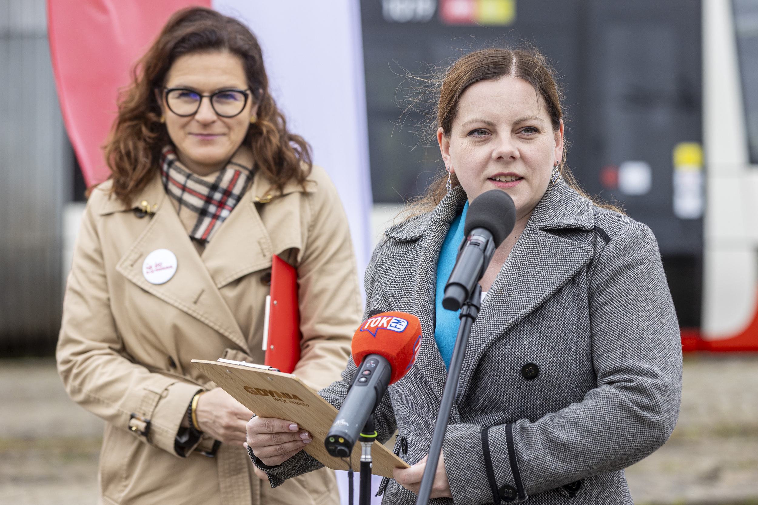 Gdańsk. Prezydentki Gdyni, Aleksandra Kosiorek, Sopotu, Magda Czarzyńska-Jachim oraz Aleksandra Dulkiewicz, prezydent Gdańska wzięły udział w briefingu prasowym dotyczącym funkcjonowania komunikacji miejskiej w dniu wyborów prezydenckich, który odbył się na pętli tramwajowej w Oliwie (Fot. mat. pras.)