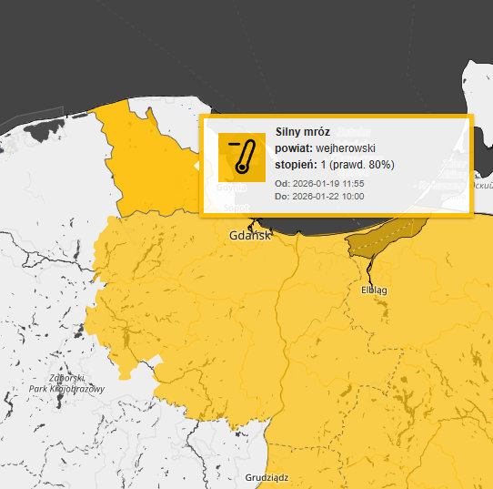 IMGW-PIB Centralne Biuro Meteorologicznych Prognoz Morskich w Gdyni wydało ostrzeżenie pierwszego stopnia przed silnym mrozem w części województwa pomorskiego. Ostrzeżenia dotyczą powiatów: gdańskiego, wejherowskiego, kartuskiego, kościerskiego, starogardzkiego, tczewskiego, malborskiego, nowodworskiego, sztumskiego, kwidzyńskiego i miasta Gdańsk.