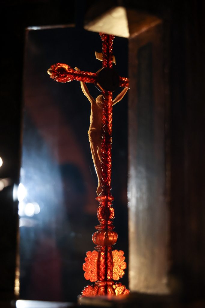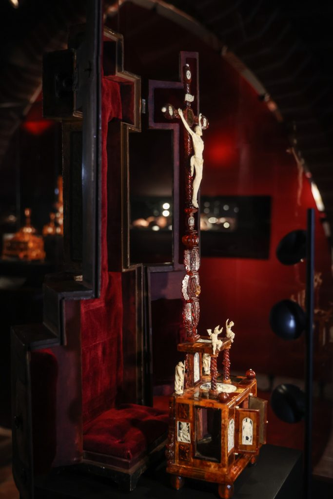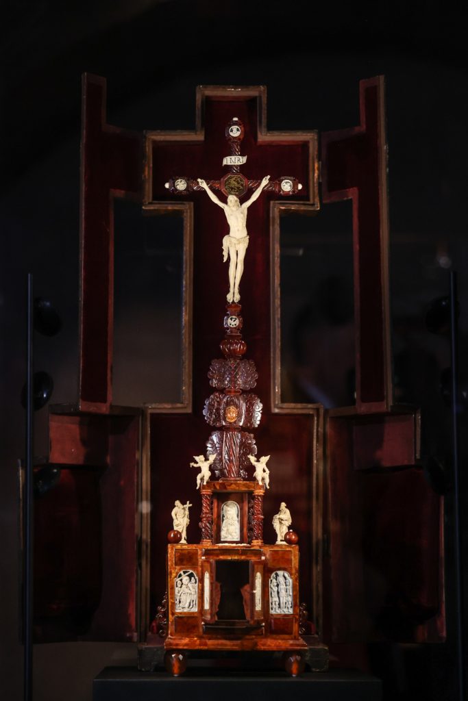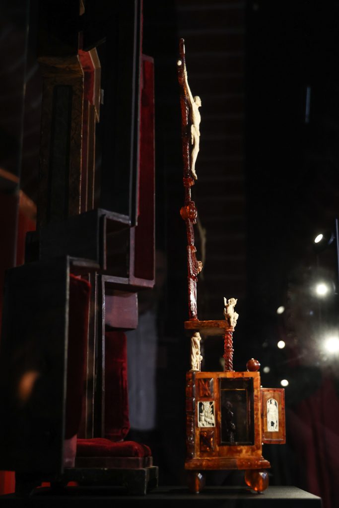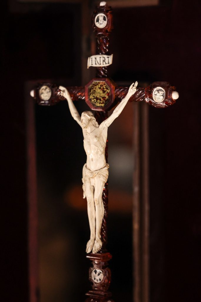 Ołtarzyk w formie krucyfiksu, wykonany w warsztacie gdańskim, pochodzi z ok. 1670 roku. Jest dekorowany plakietkami z kości słoniowej nawiązującymi do Męki Pańskiej (Niesienie krzyża, Biczowanie, Modlitwa w Ogrójcu, Salvator Mundi), wizerunkami świętych męczennic (św. Barbara i Katarzyna) oraz rzeźbami wykonanymi w tym samym materiale (św. Piotr i Paweł, aniołki, Chrystus Ukrzyżowany). Wewnątrz mensy ołtarzyka umieszczona jest figura Chrystusa wykonana w bursztynie.
