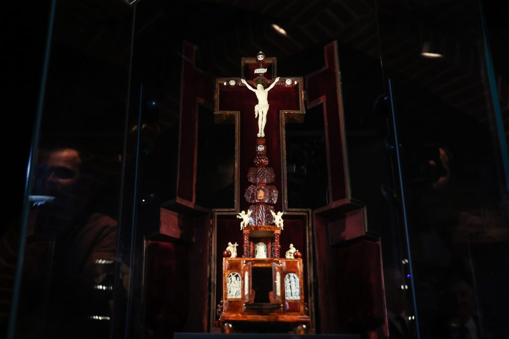 Zastosowano tu także typową dla tego okresu formę konstrukcji o drewnianym szkielecie, umożliwiającą wykonywanie obiektów o znacznie większych gabarytach. Interesującym jest również drewniane etui z epoki w formie szafki powtarzającej kształt krucyfiksu, o ozdobnej oprawie – z zewnątrz obłożone garbowaną skórą, wewnątrz bordowym aksamitem. Ołtarzyk kosztował 290 tys. euro.