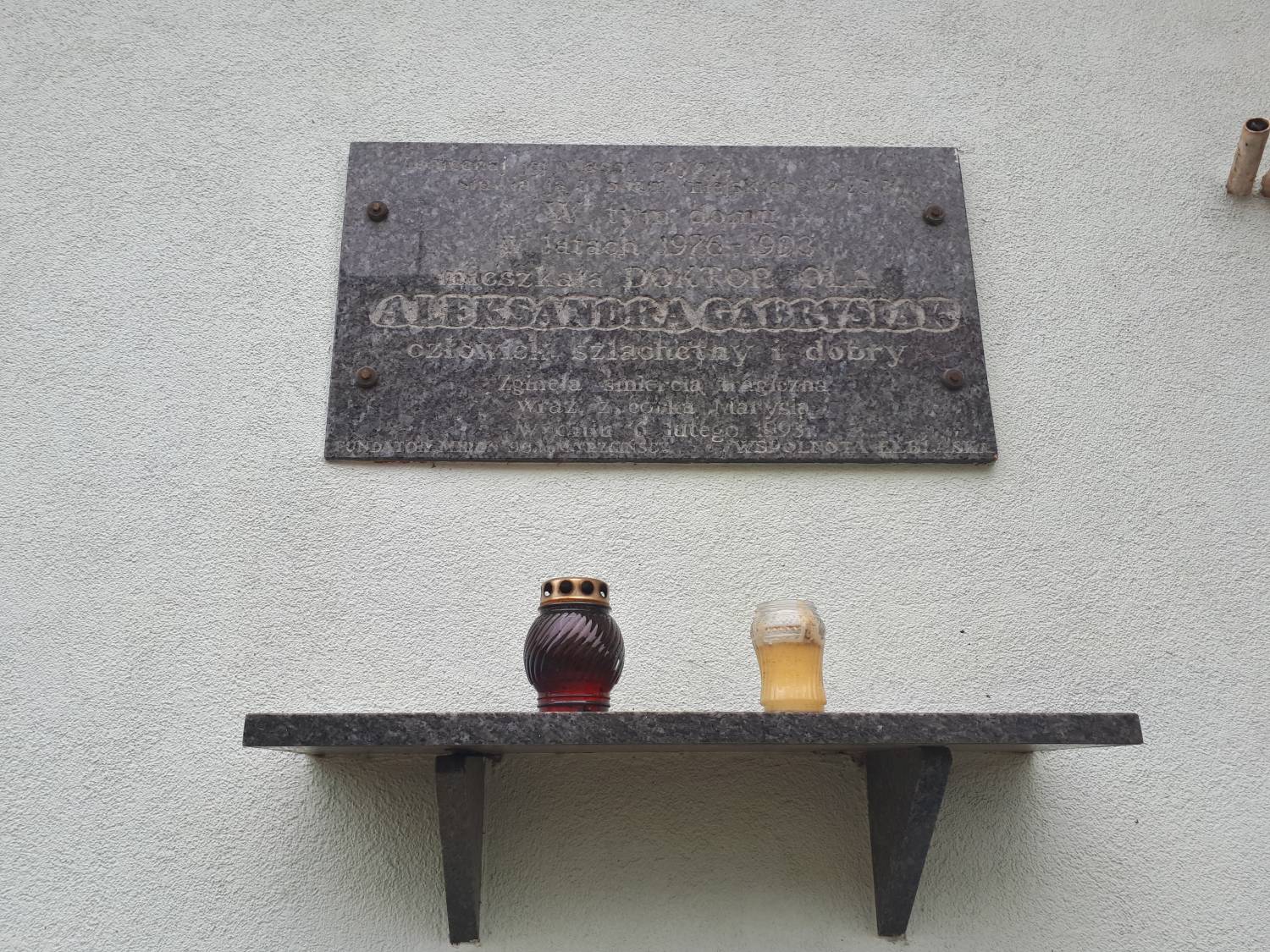 Tablica upamiętniająca dr Aleksandrę Gabrysiak na budynku przy ul. 1 Maja w Elblągu, gdzie mieszkała i została zamordowana wraz z córką (fot. Kamil.ryy/Wikimedia Commons)