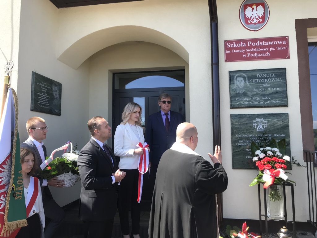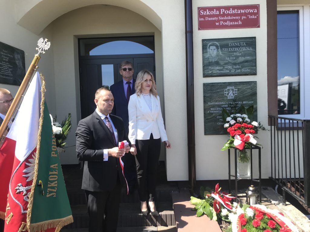 – Jesteśmy bardzo wdzięczni Instytutowi Pamięci Narodowej. Dzisiejsze wydarzenie zrodziło się dzięki inicjatywie zastępcy prezesa IPN dr. hab. Karola Polejowskiego. To historyczne wydarzenie w naszej szkole, bo u nas odbyła się 100. lekcja w ramach Drużyny „Inki”. Myślimy, że to dzięki temu, że nasza placówka jest pierwszą szkołą z imieniem Danuty Siedzikówny. Dzisiaj przypada również 13. rocznica nadania tego imienia. Odsłoniliśmy dodatkową tablicę, która informuje, kim była „Inka”. Była to moja prośba, dlatego że kiedy ja uczęszczałam do szkoły, nie mówiono o Żołnierzach Niezłomnych, był to temat tabu. Stąd dużo dorosłych, dojrzałych osób, mijając budynek naszej szkoły i odczytując jej zaszczytne imię, pytają się, kim była Danuta Siedzikówna. Ona była bohaterką, sanitariuszką i jest naszą patronką – mówiła Barbara Lis-Driwa, dyrektor szkoły w Podjazach.