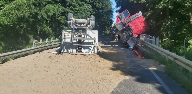 Co najmniej kilka godzin potrwa blokada trasy z Barkowa do Debrzna w powiecie człuchowskim. Przed 10:00 na moście nad rzeką Chrząstową przewróciła się ciężarówka.
